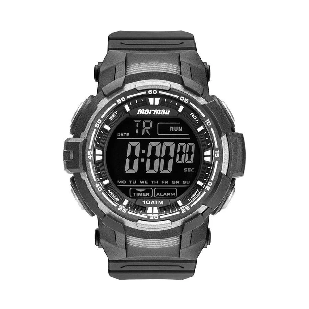 Relógio Mormaii da Linha Acqua a prova dágua 100m. Modelo digital na cor preta com pulseira em polímero e caixa também em polímero super robusta 53mm - big case! Item com detalhes em branco no aro interno e display positivo.