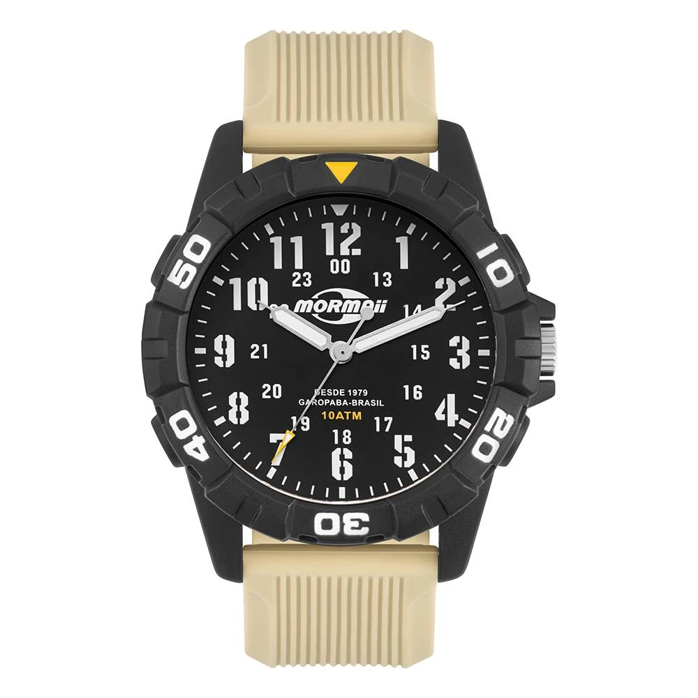 Caixa de Polímero PretaPulseira de Silicone CáquiFundo de Aço ParafusadoResistente à Água 10 ATMDiâmetro / Largura da Caixa: 44.00 MMFunções: AnalógicoVidro: AcrílicoAro Fixo Preto com números (indicadores dos minutos)Alimentação do maquinário BateriaMostrador Preto com Todos os NúmerosGarantia de 1 Ano
