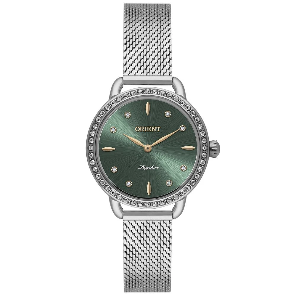 Caixa: AçoPulseira: Malha de Aço MeshMedida da caixa: 30MMVidro: Cristais de SafiraAlimentação do maquinário: BateriaResistência à água: 30 mfunções: AnalógicoMostrador Verde com pedras e detalhes em douradoAro externo de pedrasFundo de PressãoMaquinário Japonês