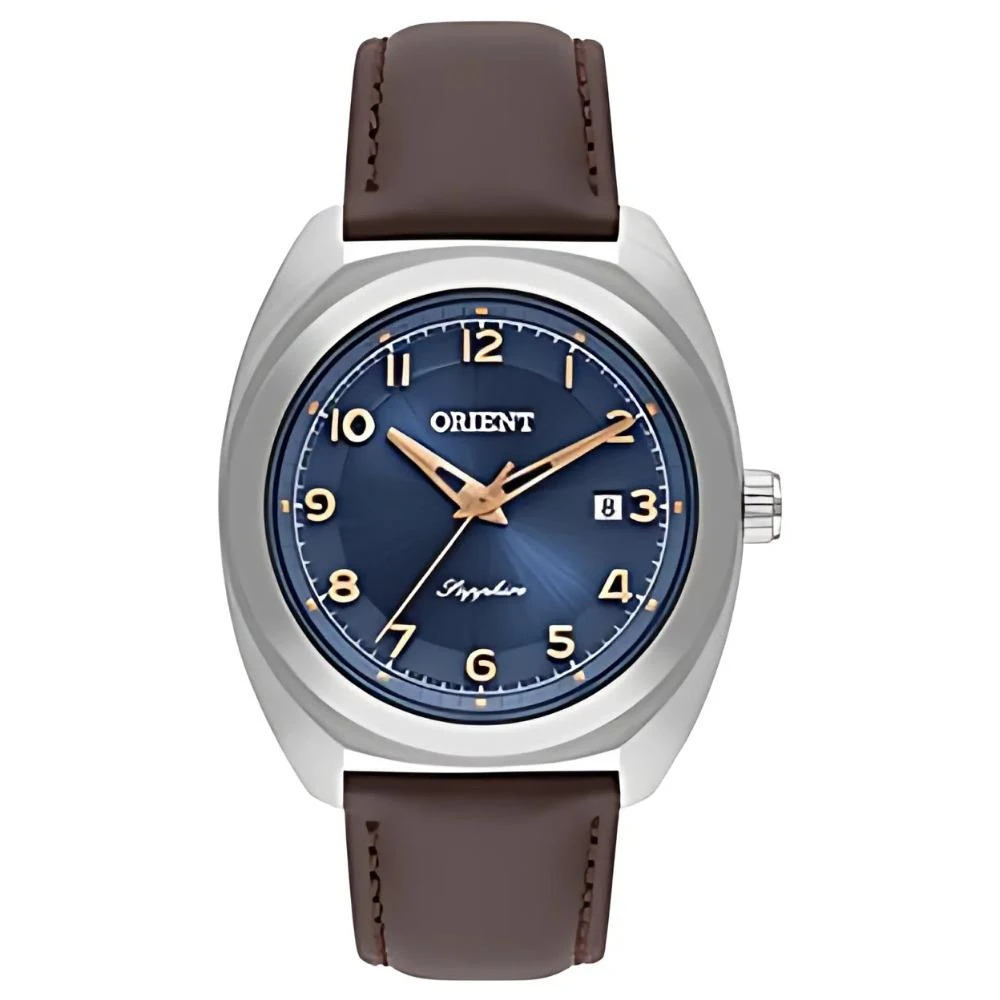 Vidro: SafiraFunções: Analógico, CalendárioResistencia à água: 50 MCaracterísticas: com caixa Aço inoxidável e pulseira Couro Legítimo MarromDiâmetro da caixa: 4,0 cmAlimentação do Maquinário: BateriaMostrador Azul com todos os númerosFundo de PressãoGarantia de 1 ano