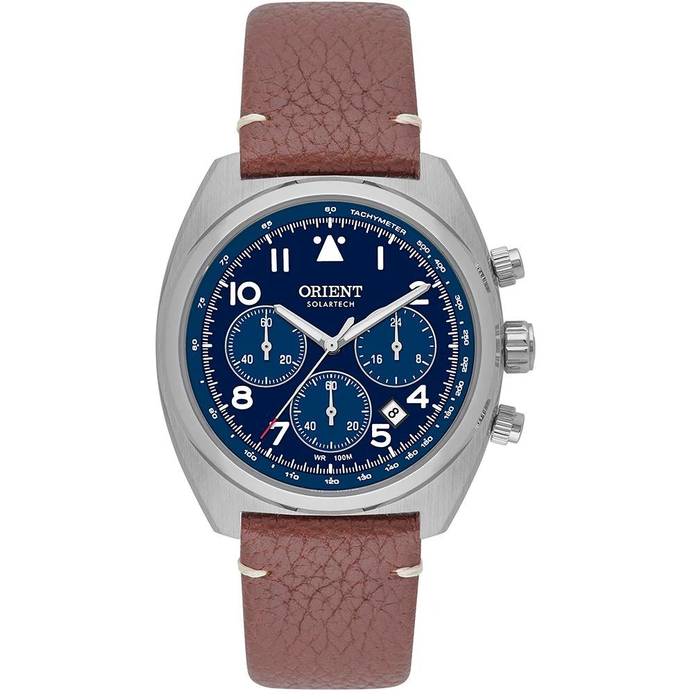 Vidro: SafiraFunções: Calendario, Analógico, Solar, Cronógrafo, TaquímetroResistencia à água: 100 MCaracterísticas: com caixa Aço inoxidável e pulseira Couro Legítimo MarromDiâmetro da caixa: 3,8 cmAlimentação do Maquinário: Energia SolarMostrador azul com númerosFundo RosqueadoLinha: Orient SolartechGarantia de 1 ano