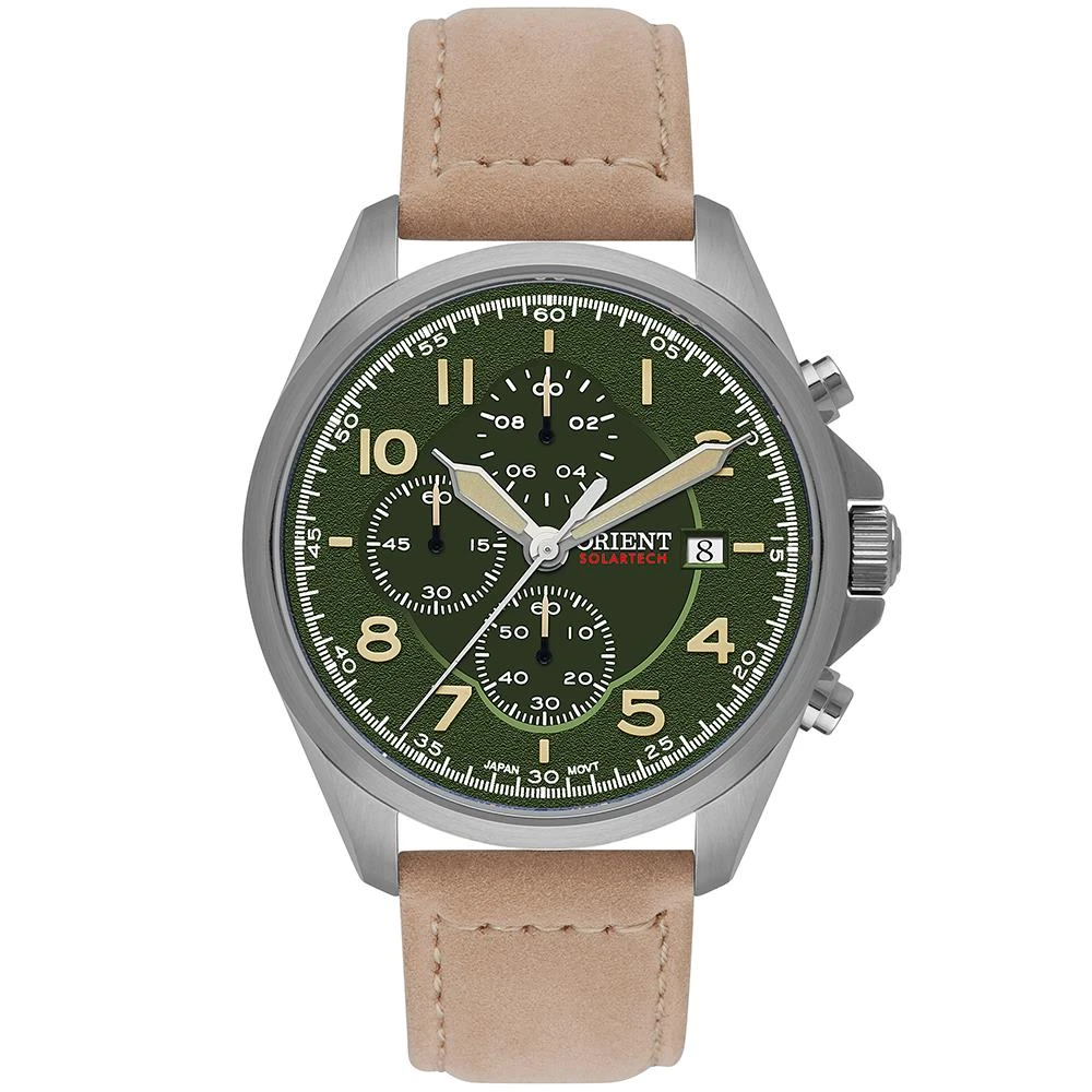 Vidro: SafiraFunções: Calendario, Analógico, Solar, CronógrafoResistencia à água: 100 MCaracterísticas: com caixa Aço inoxidável e pulseira Couro Legítimo BegeDiâmetro da caixa: 4,0 cmAlimentação do Maquinário: Energia SolarMostrador verde com númerosFundo RosqueadoLinha: Orient SolartechGarantia de 1 ano