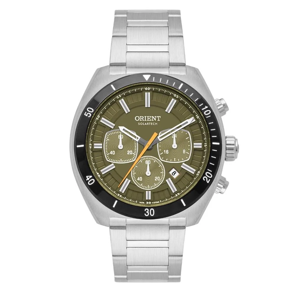 Vidro: Cristal MineralFunções: Calendario, Analógico, Solar, CronógrafoResistencia à água: 100 MCaracterísticas: com caixa Aço inoxidável e pulseira Aço inoxidávelDiâmetro da caixa: 4,2 cmAlimentação do Maquinário: Energia SolarMostrador Verde com detalhes em laranjaAro Fixo PretoFundo RosqueadoLinha: Orient SolartechGarantia de 1 ano