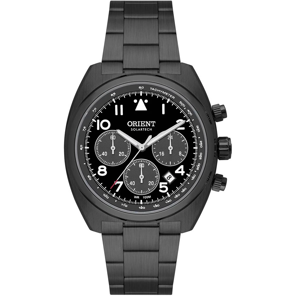 Vidro: SafiraFunções: Calendario, Analógico, Solar, Cronógrafo, TaquímetroResistencia à água: 100 MCaracterísticas: com caixa Aço inoxidável e pulseira Aço inoxidávelDiâmetro da caixa: 3,8 cmAlimentação do Maquinário: Energia SolarMostrador preto com númerosFundo RosqueadoLinha: Orient SolartechGarantia de 1 ano