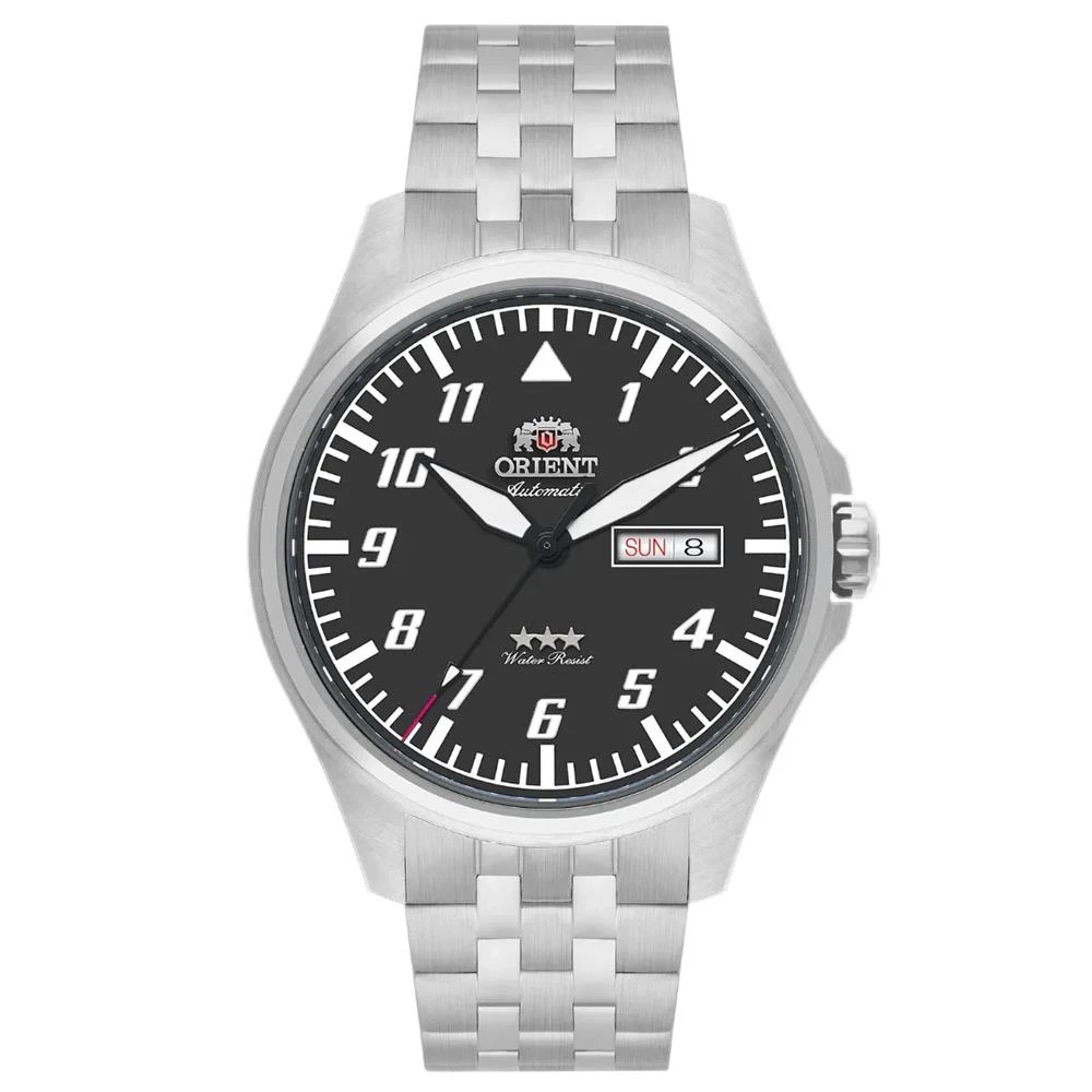 linha: Orient Automatic Três Estrelas Sport Airvidro: Safirafunções: Automático, Analógico, Calendário Mensal, Calendário Semanal com opção em Português e Inglês, Hacking (Ponteiro de segundos para no modo de acerto de horas), Enrolamento manual (Premite dar corda diretamente na coroa), Coroa Rosqueadaresistência à água: 100 Mcaracterísticas: com caixa Aço inoxidável e pulseira Aço Inoxidáveldiâmetro da caixa: 4,1 cmalimentação do maquinário: Mecânico (Automático)