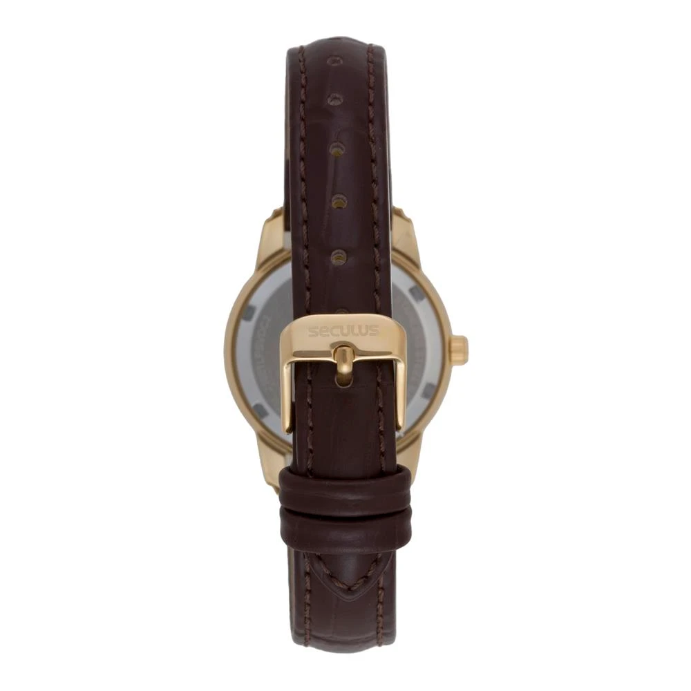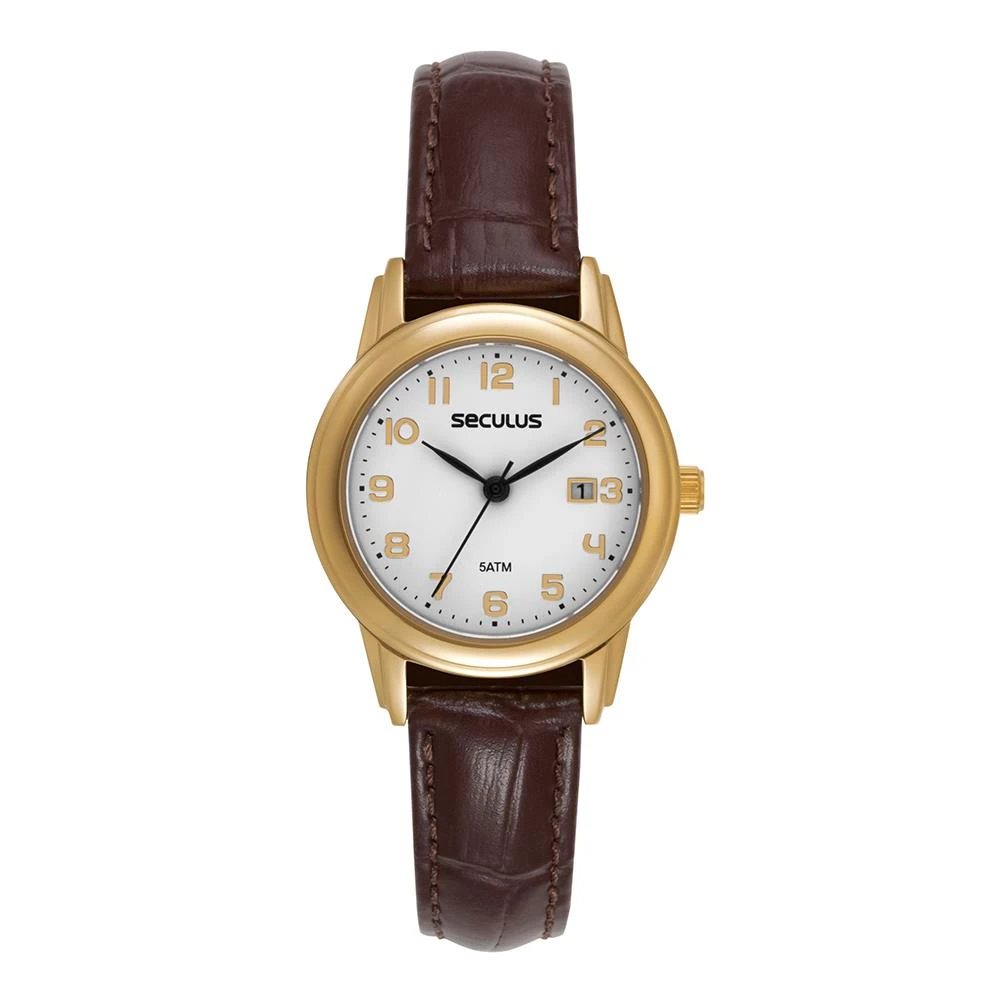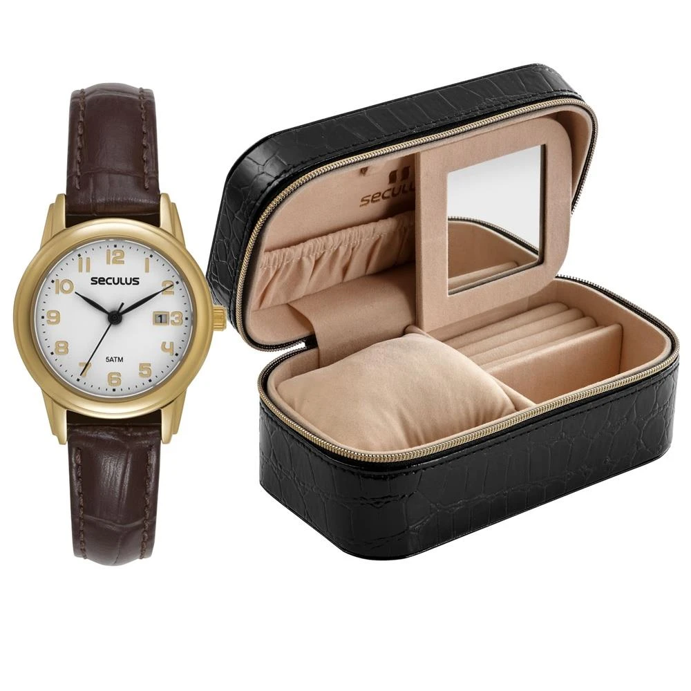 Vidro: Cristal MineralFunções: Analógico, CalendárioResistencia à água: 50 MCaracterísticas: com caixa de Metal e pulseira de Couro Legítimo MarromDiâmetro da caixa: 3,0 cmFundo RosqueadoAlimentação do Maquinário: BateriaMostrador Branco com NúmerosEstojo do relógio é um lindo porta jóiasGarantia de 2 anos