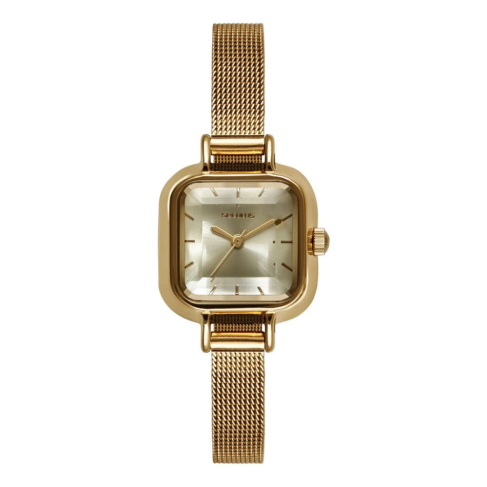 Vidro: Cristal Mineral FacetadoFunções: AnalógicoResistencia à água: 30 MCaracterísticas: com caixa de Metal Especial e pulseira de Malha de Aço MeshDiâmetro da caixa: 2,4 cm x 2,4 cmFundo de PressãoAlimentação do Maquinário: BateriaMostrador DouradoMecanismo JaponêsGarantia de 2 anos