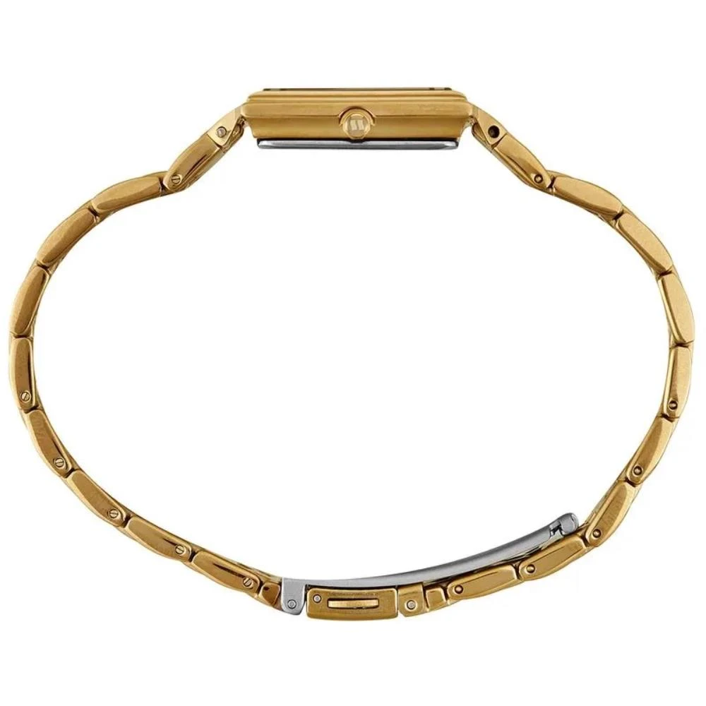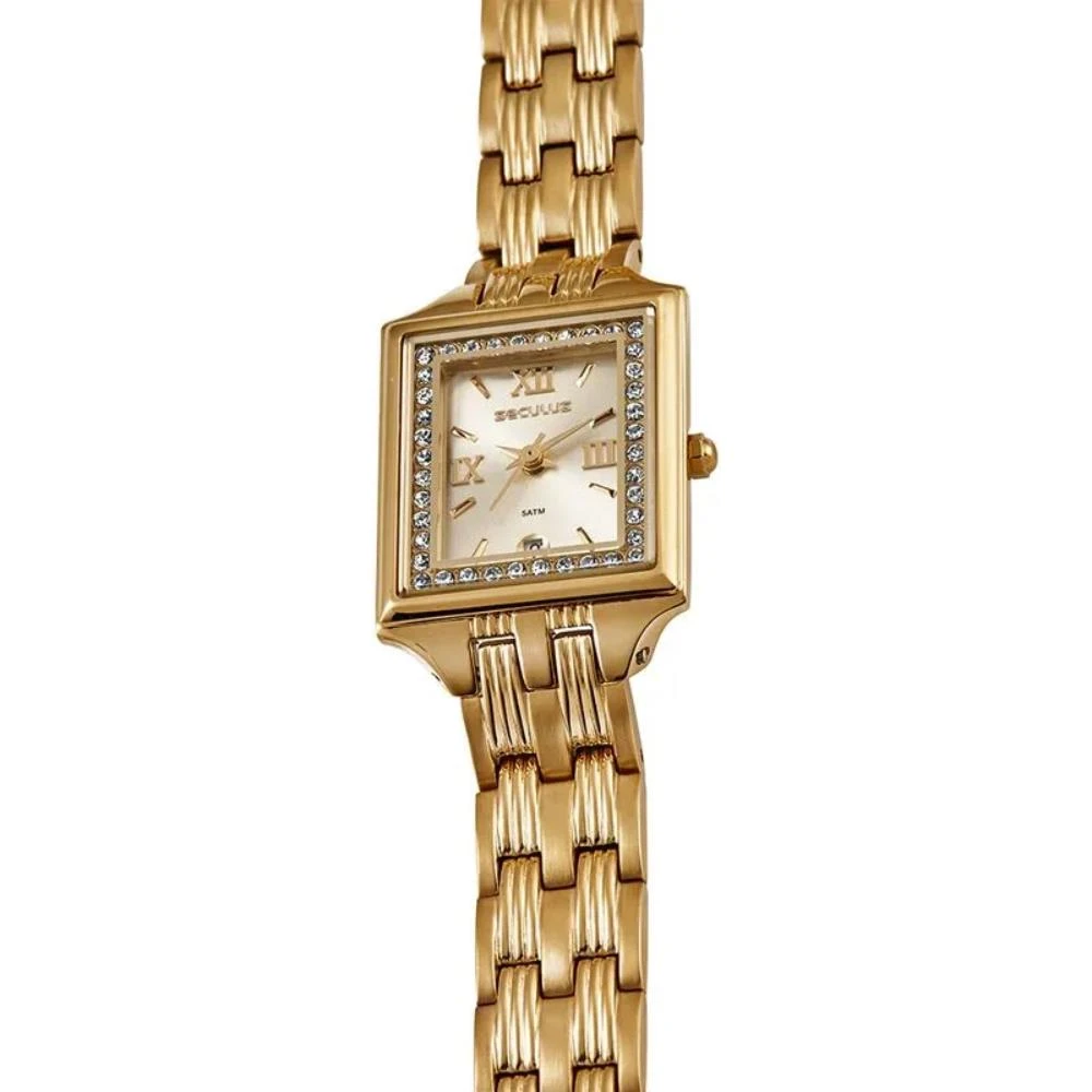 Vidro: Cristal MineralFunções: Analógico, CalendárioResistencia à água: 50 MCaracterísticas: com caixa de Aço Inoxidável e pulseira de Aço InoxidávelDiâmetro da caixa: 2,2 cm x 2,5 cmFundo de PressãoAlimentação do Maquinário: BateriaMostrador Dourado com algarismos romanos e PedrasMecanismo JaponêsGarantia de 2 anos