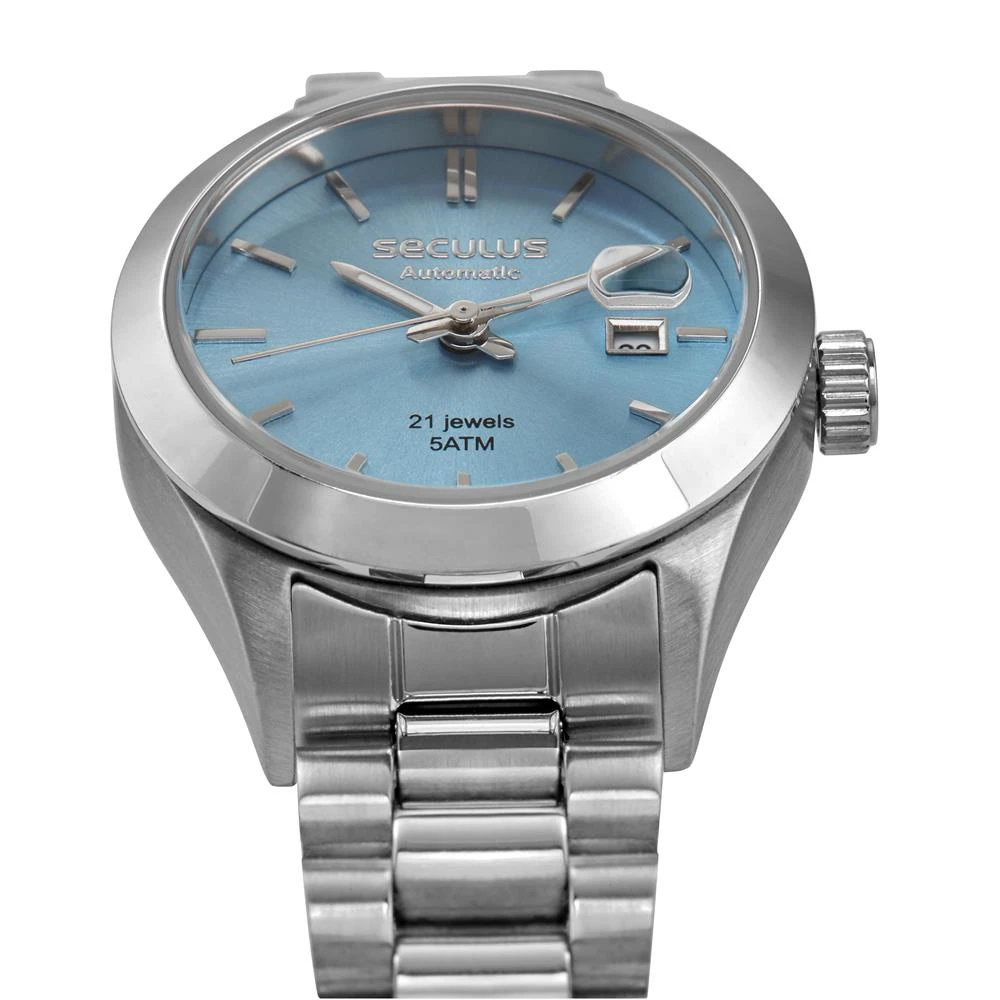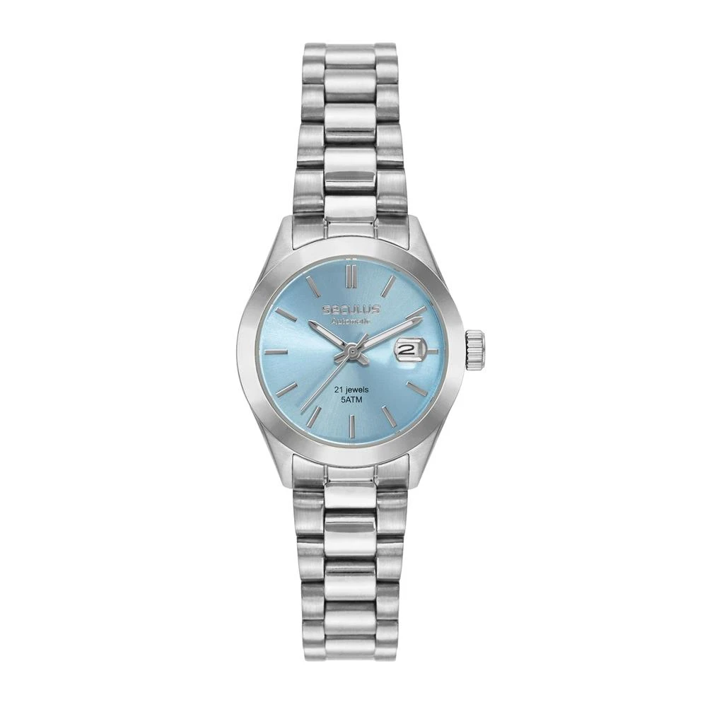Vidro: Cristal MineralFunções: Automático, Analógico, Calendário com LupaResistencia à água: 50 MCaracterísticas: com caixa de Aço inoxidável e pulseira de Aço InoxidávelDiâmetro da caixa: 2,8 cmFundo RosqueadoCom fundo de vidro que permite a visualização do maquinário em funcionamentoLinha: Seculus AutomaticAlimentação do Maquinário: Mecânico (Automático, Corda).Mostrador Azul ClaroGarantia de 2 anos
