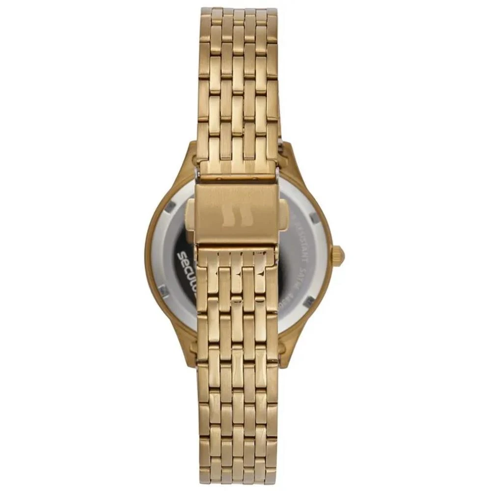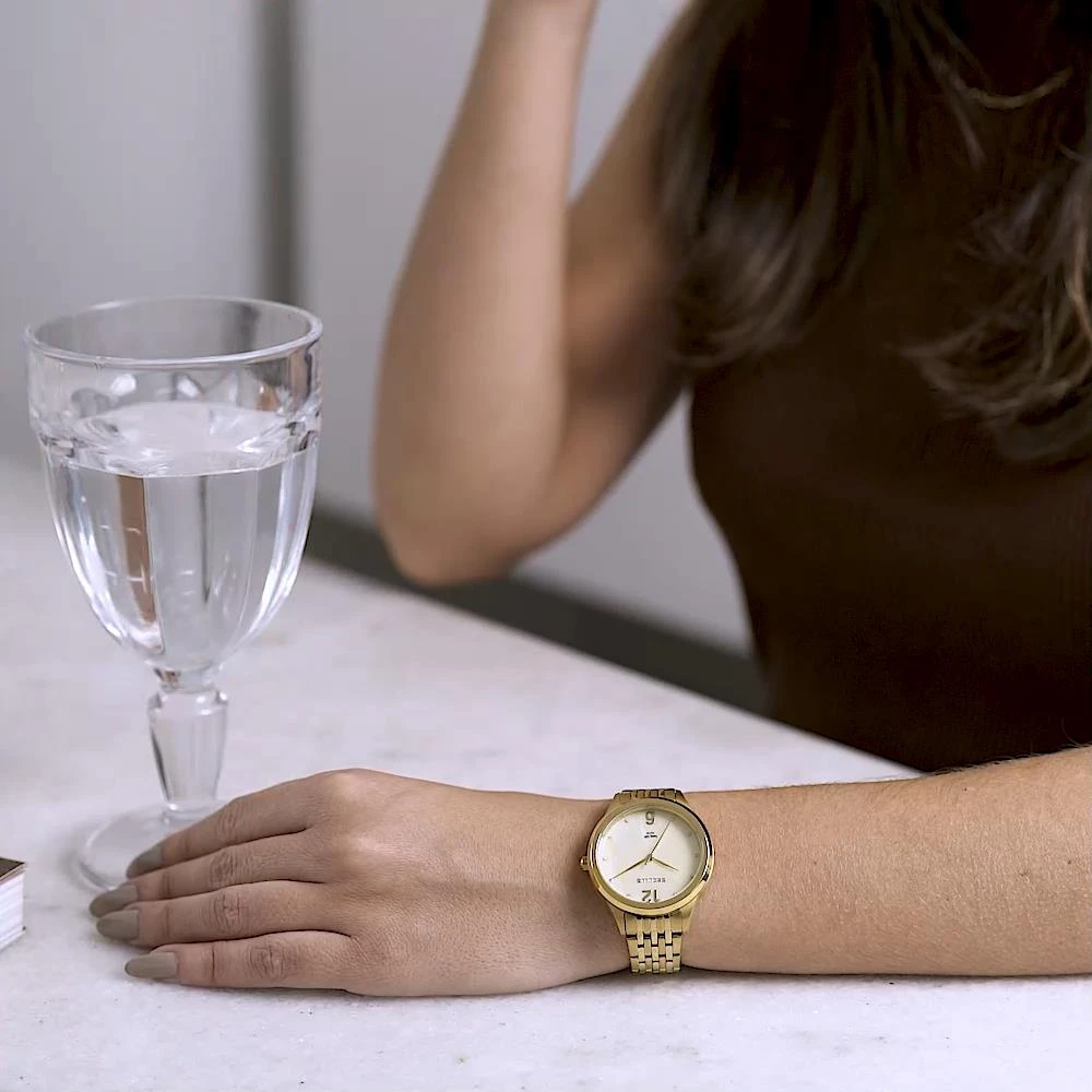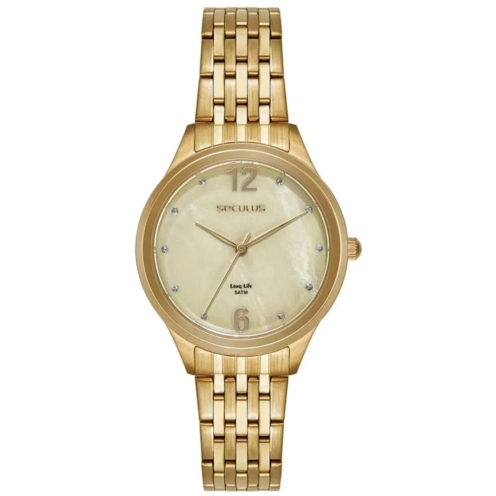 Vidro: Cristal MineralFunções: AnalógicoResistencia à água: 50 MCaracterísticas: com caixa de Aço e pulseira de AçoDiâmetro da caixa: 3,6 cmFundo RosqueadoAlimentação do Maquinário: BateriaMostrador Madreperola Bege com números e pedrasLinha: Seculus Long LifeGarantia de 2 anos