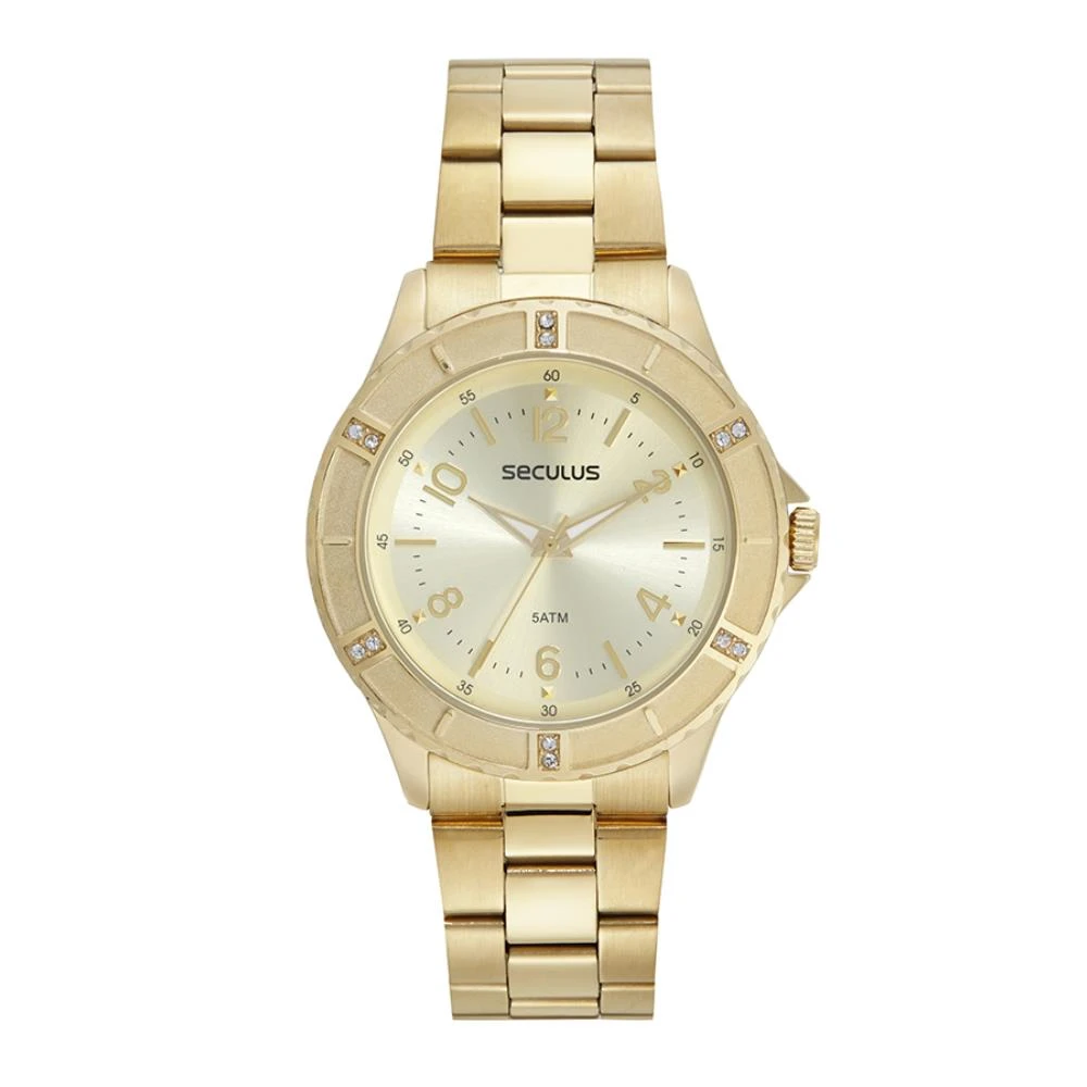 Vidro: Cristal MineralFunções: AnalógicoResistencia à água: 50 MCaracterísticas: com caixa de Metal Especial e pulseira de Aço InoxidávelDiâmetro da caixa: 4,0 cmFundo RosqueadoAlimentação do Maquinário: BateriaMostrador Champanhe com númerosAro com PedrasGarantia de 2 anos