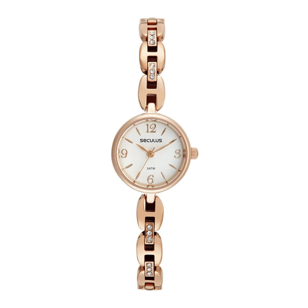 Vidro: Cristal MineralFunções: Bracelete, AnalógicoResistencia à água: 50 MCaracterísticas: com caixa de Metal e pulseira de MetalDiâmetro da caixa: 2,3 cmAltura da caixa: 0,8 cmFundo RosqueadoAlimentação do Maquinário: BateriaMostrador Prateado com números+ Pulseira Rosé SemijóiaGarantia de 2 anos