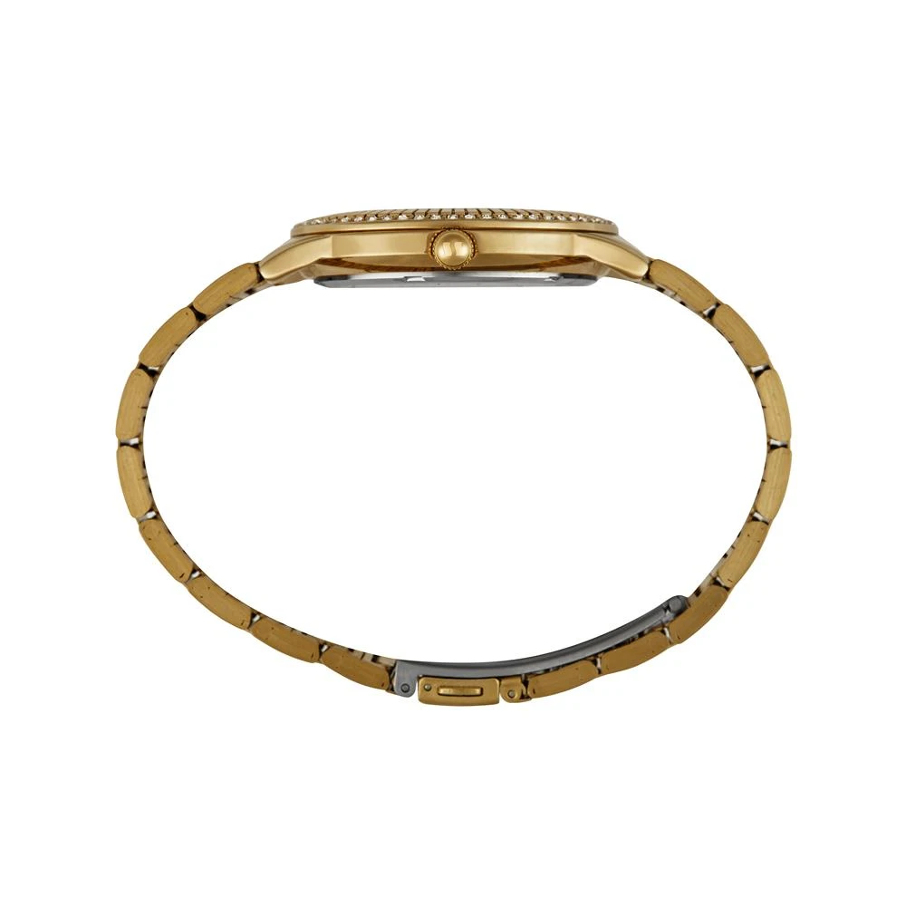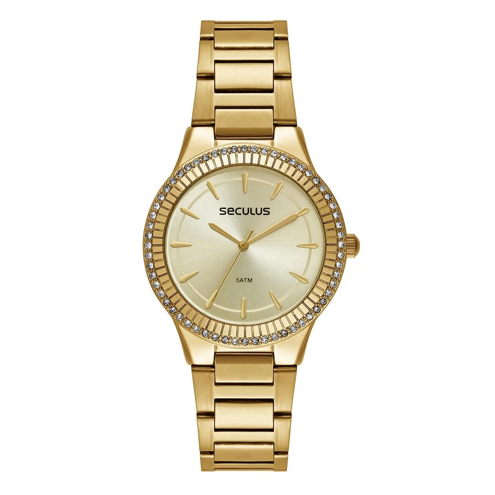 Vidro: Cristal MineralFunções: AnalógicoResistencia à água: 50 MCaracterísticas: com caixa de Metal Especial e pulseira de Aço InoxidávelDiâmetro da caixa: 4,2 cmFundo RosqueadoAlimentação do Maquinário: BateriaMostrador DouradoAro Fixo de PedrasGarantia de 2 anos