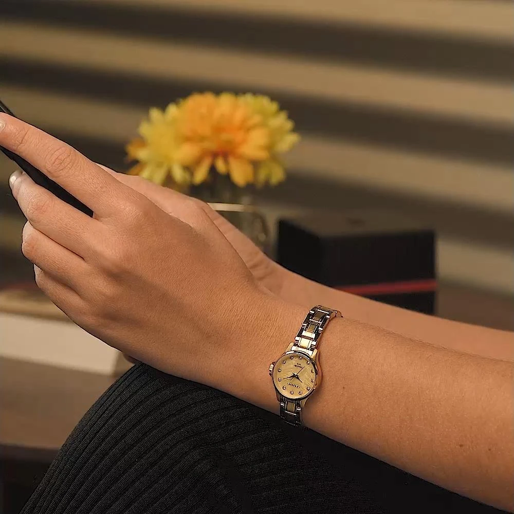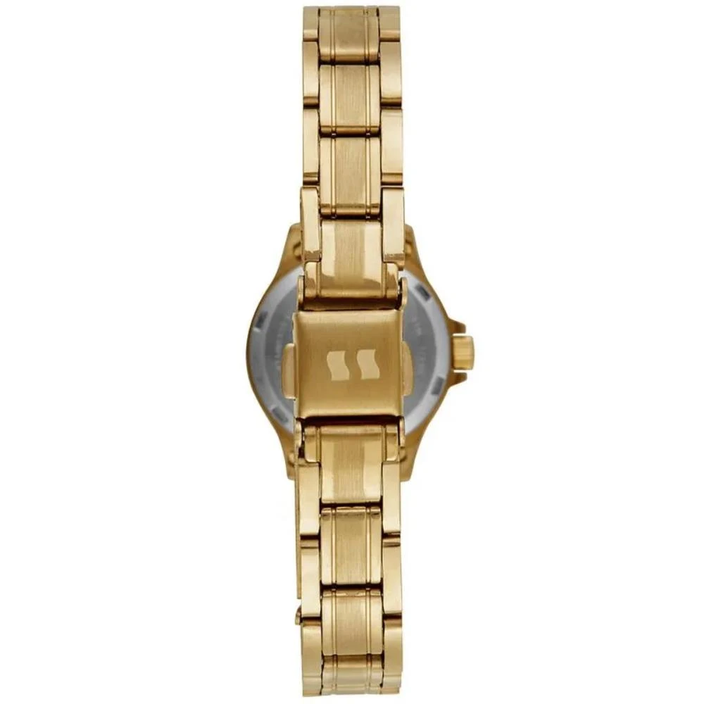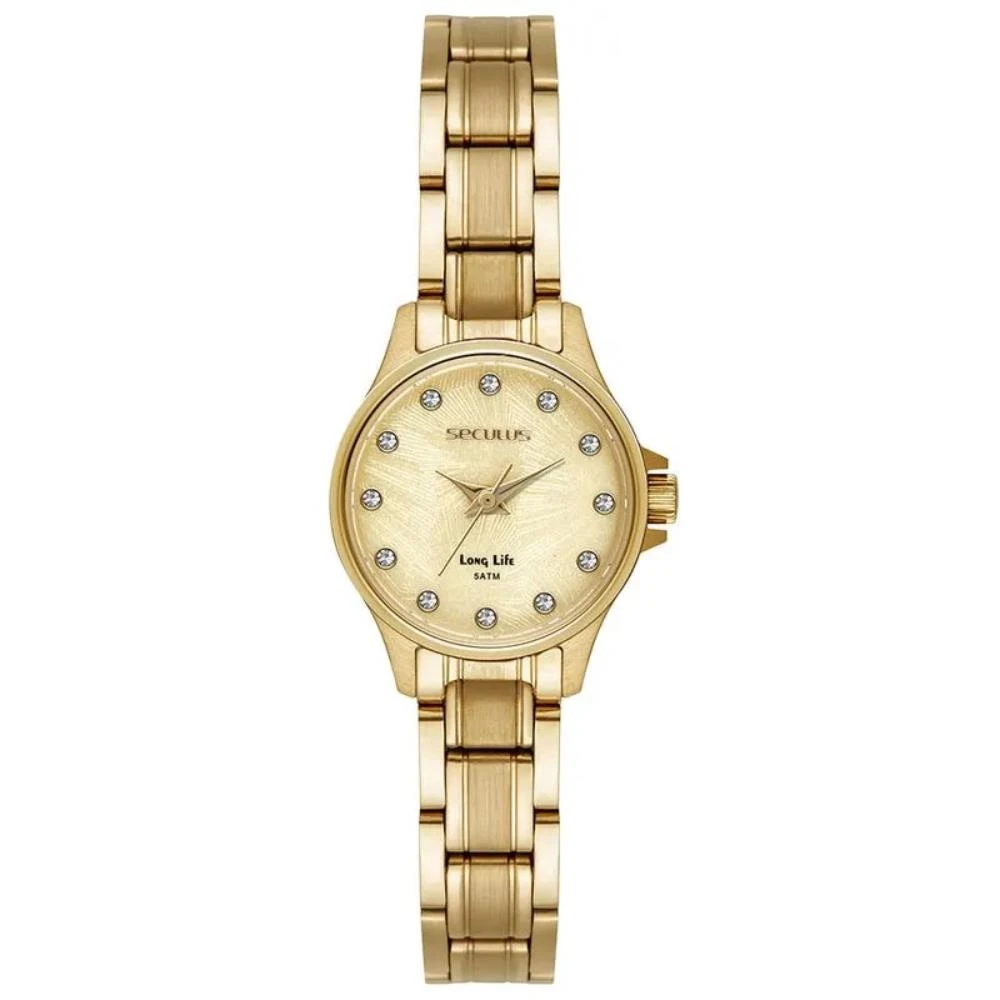 Vidro: Cristal MineralFunções: AnalógicoResistencia à água: 50 MCaracterísticas: com caixa de Aço e pulseira de AçoDiâmetro da caixa: 2,2 cmFundo RosqueadoAlimentação do Maquinário: BateriaMostrador Dourado com pedrasLinha: Seculus Long LifeGarantia de 2 anos