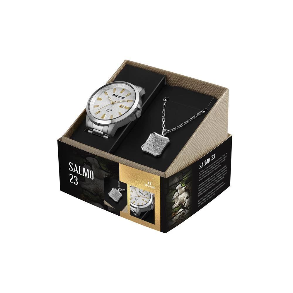 Vidro: Cristal MineralFunções: Analógico, CalendárioResistencia à água: 50 MCaracterísticas: com caixa de Aço inoxidável e pulseira de Aço InoxidávelDiâmetro da caixa: 4,8 cmFundo de RoscaLinha Long LifeTema Religioso+ Corrente e Pingente Semijóia (Pai Nosso)Mostrador Prateado Com a Oração do Pai NossoAlimentação do Maquinário: BateriaGarantia de 2 anos