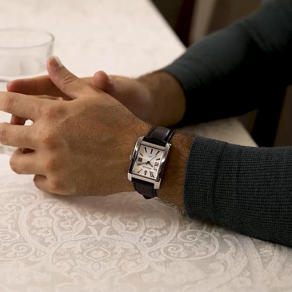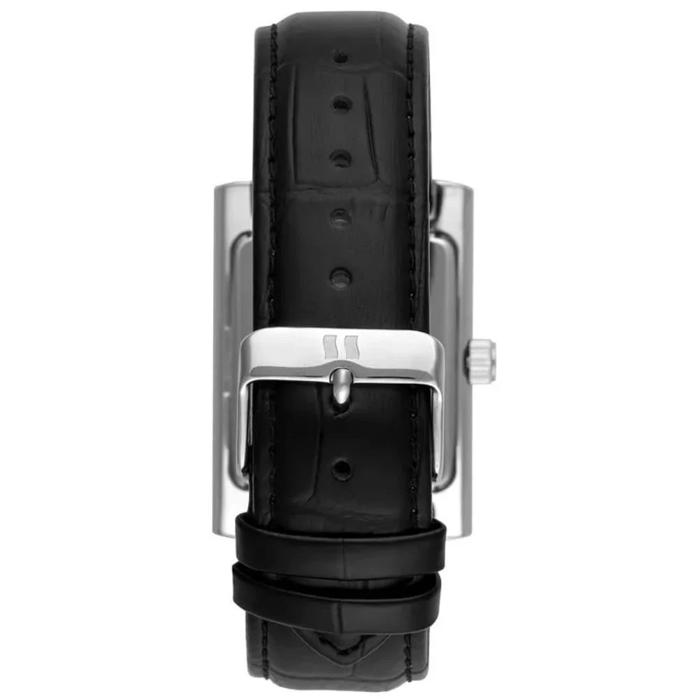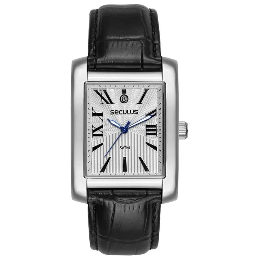 Vidro: Cristal MineralFunções: Analógico, Calendário, RetangularResistencia à água: 50 MCaracterísticas: com caixa de Aço inoxidável e pulseira de Couro Legítimo PretaDiâmetro da caixa: 3,3 cm x 3,5 cmFundo de PressãoAlimentação do Maquinário: BateriaMostrador Prateado com Algarismos RomanosGarantia de 2 anos