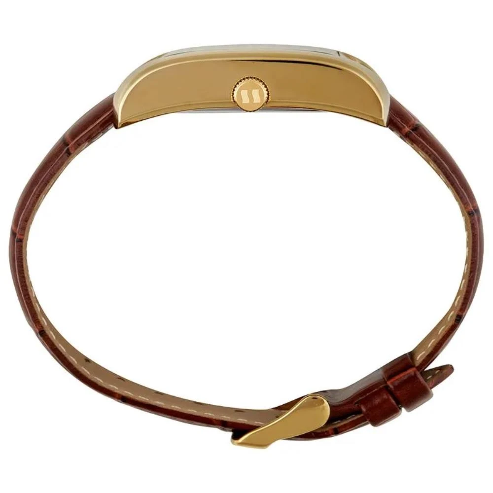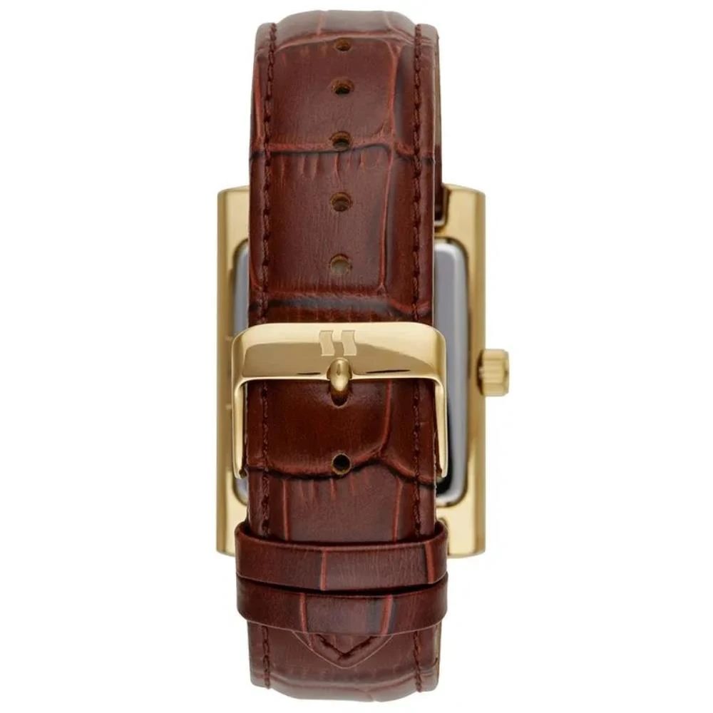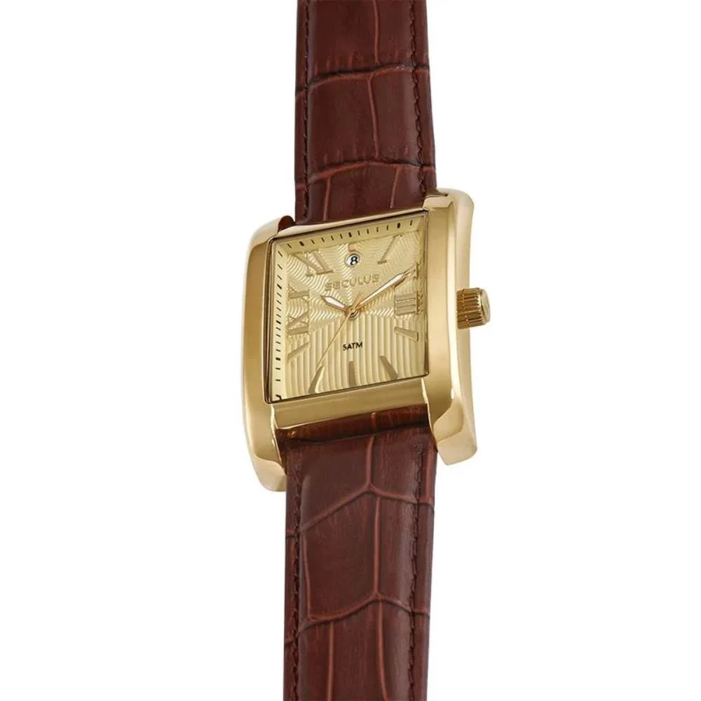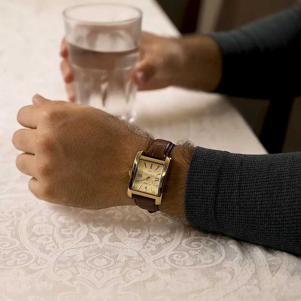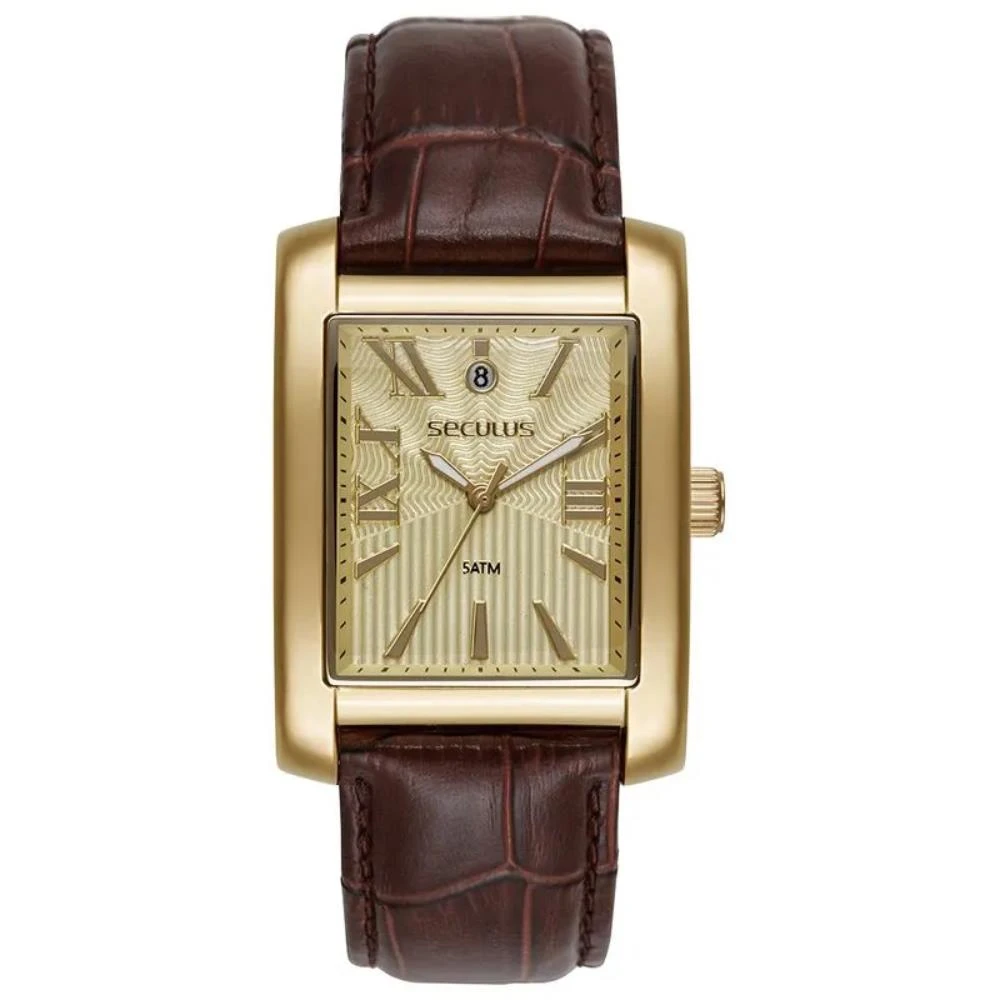 Vidro: Cristal MineralFunções: Analógico, Calendário, RetangularResistencia à água: 50 MCaracterísticas: com caixa de Aço inoxidável e pulseira de Couro Legítimo MarromDiâmetro da caixa: 3,3 cm x 3,5 cmFundo de PressãoAlimentação do Maquinário: BateriaMostrador Dourado com Algarismos RomanosGarantia de 2 anos