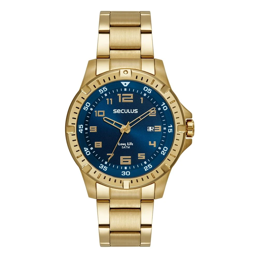 Vidro: Cristal MineralFunções: Analógico, CalendárioResistencia à água: 50 MCaracterísticas: com caixa de Aço inoxidável e pulseira de Aço InoxidávelDiâmetro da caixa: 4,5 cmFundo de RoscaLinha Long LifeAlimentação do Maquinário: BateriaMostrador Azul com todos os númerosAro Fixo DouradoGarantia de 2 anos