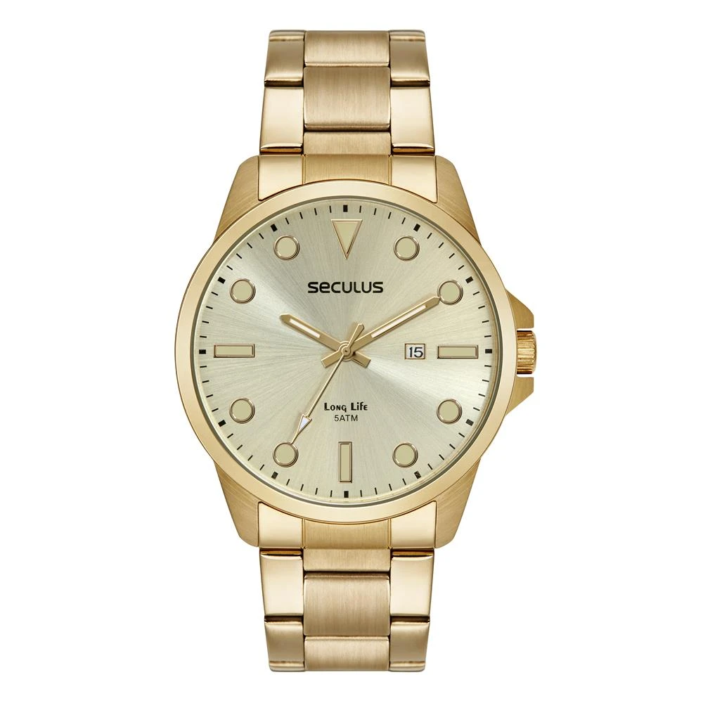 Vidro: Cristal MineralFunções: Analógico, CalendárioResistencia à água: 50 MCaracterísticas: com caixa de Aço inoxidável e pulseira de Aço InoxidávelDiâmetro da caixa: 4,6 cmFundo de RoscaLinha Long LifeAlimentação do Maquinário: BateriaMostrador DouradoGarantia de 2 anos