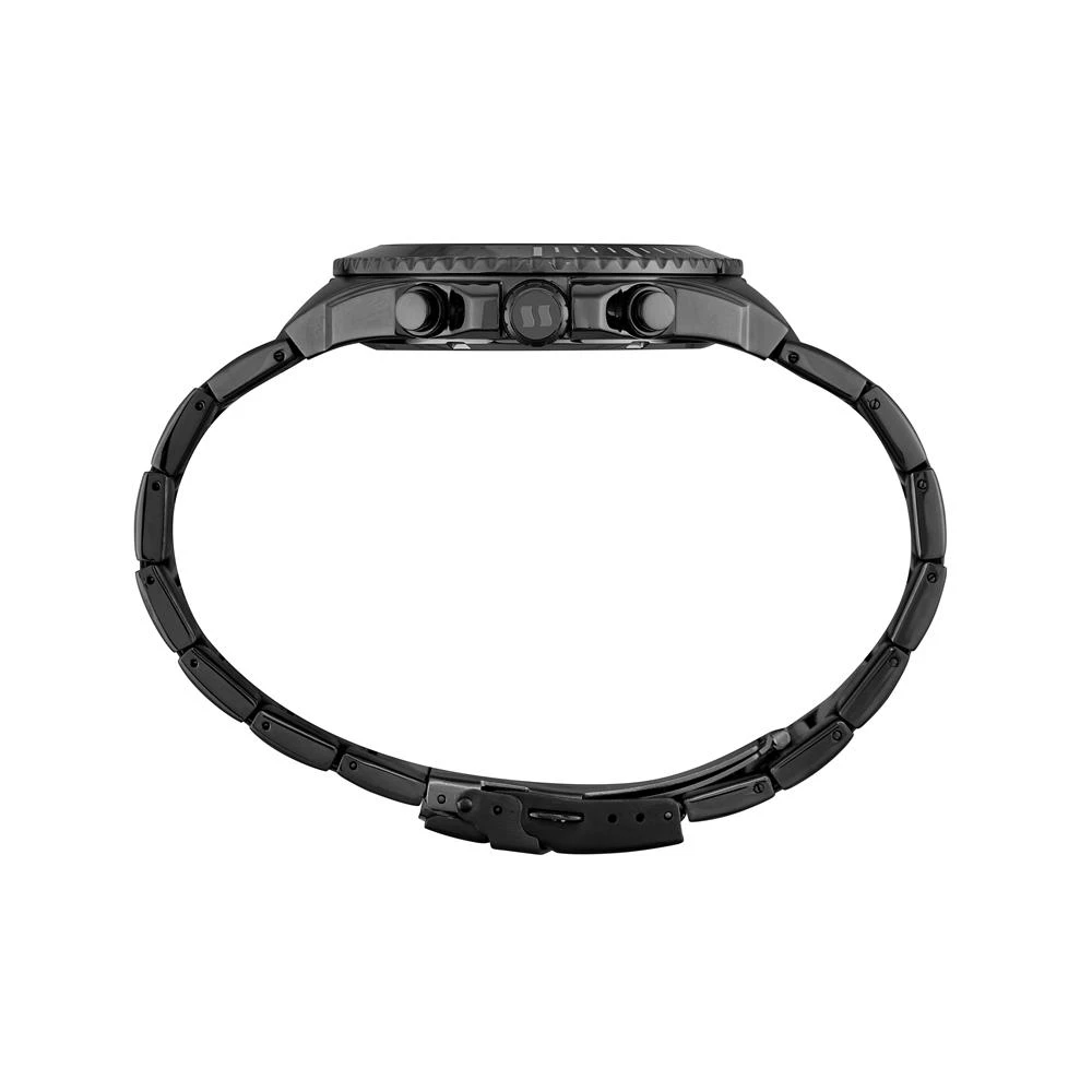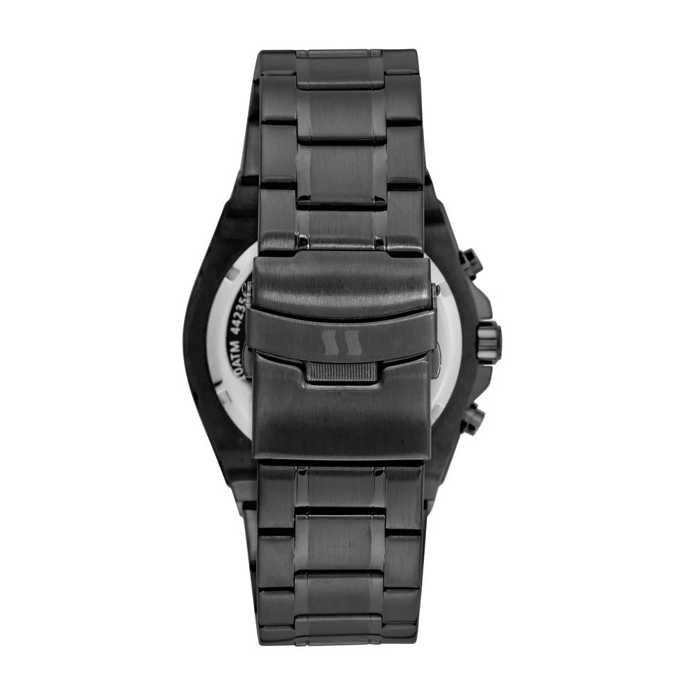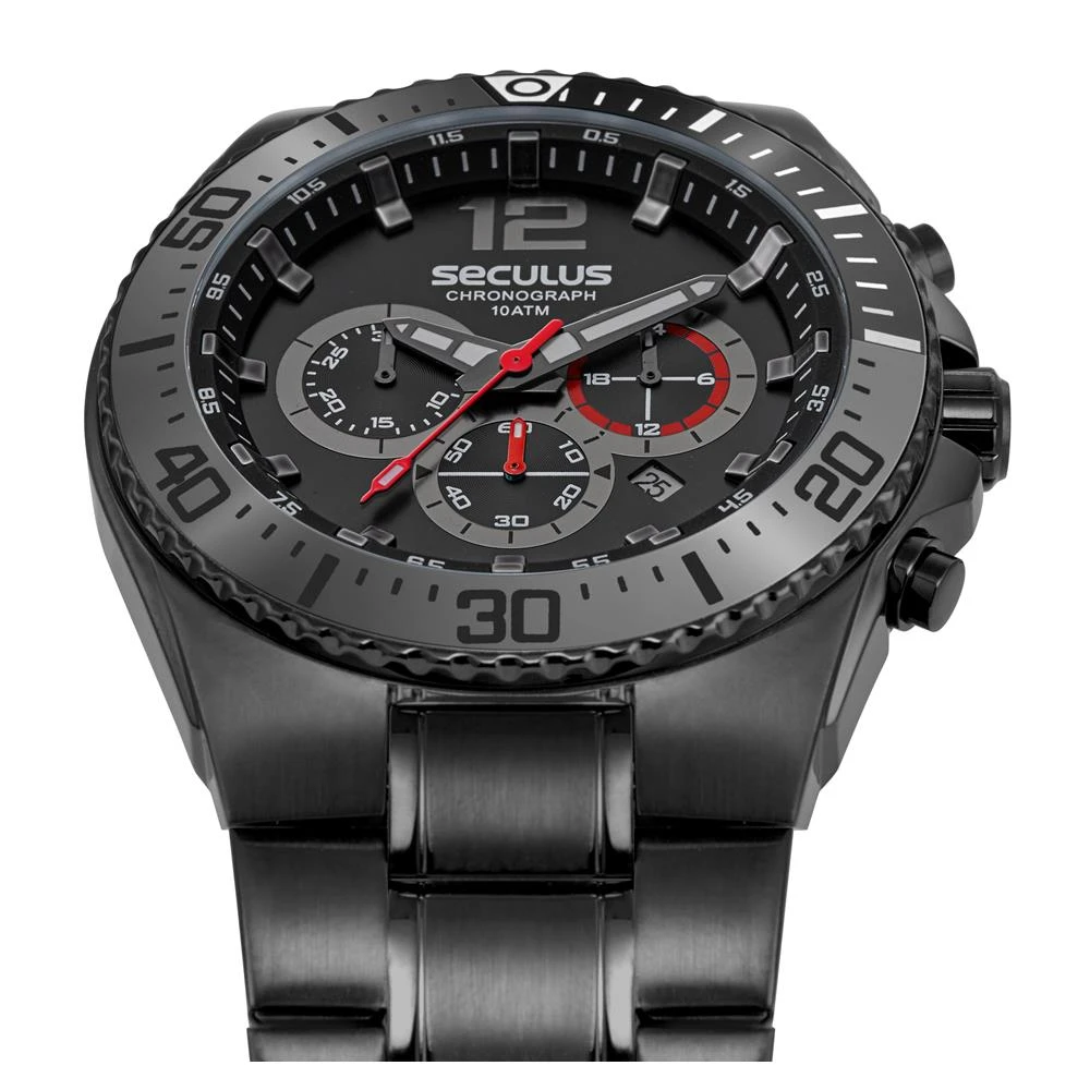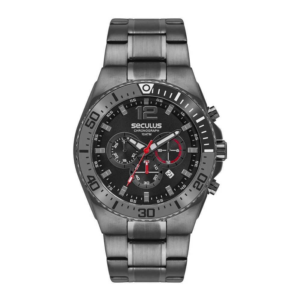 Vidro: Cristal MineralFunções: Cronógrafo, Calendário, AnalógicoResistencia à água: 100 MCaracterísticas: com caixa de Aço inoxidável e pulseira de Aço InoxidávelDiâmetro da caixa: 4,7 cmFundo de RoscaAlimentação do Maquinário: BateriaMostrador AzulAro Fixo Grafite e Preto