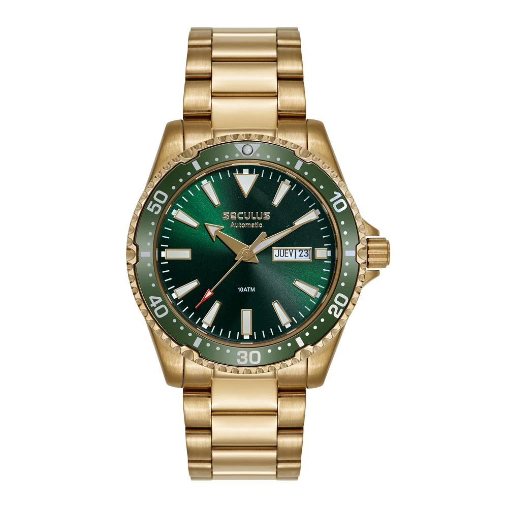 Vidro: Cristal MineralFunções: Automático, Analógico, Calendário Duplo (Mensal e Semanal em Inglês e Espanhol)Resistencia à água: 100 MCaracterísticas: com caixa de Aço inoxidável e pulseira de Aço InoxidávelDiâmetro da caixa: 4,2 cmFundo RosqueadoCom fundo de vidro que permite a visualização do maquinário em funcionamentoLinha: Seculus AutomaticAlimentação do Maquinário: Mecânico (Automático, Corda).Mostrador VerdeAro Fixo VerdeGarantia de 2 anos