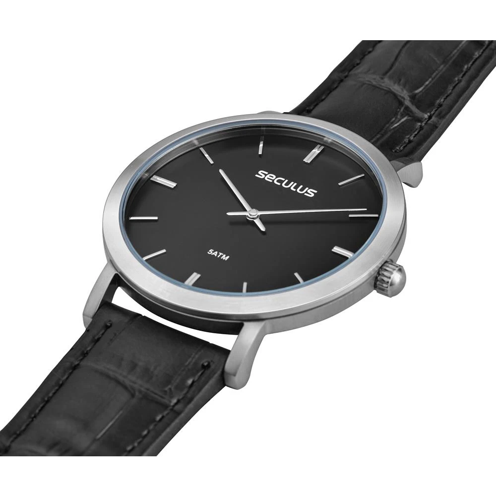 Vidro: Cristal MineralFunções: Analógico, CalendárioResistencia à água: 50 MCaracterísticas: com caixa de Aço inoxidável e pulseira de Couro Legítimo PretaDiâmetro da caixa: 4,0 cmAltura da Caixa: 0,8 cmFundo de RoscaAlimentação do Maquinário: BateriaMostrador PretoGarantia de 2 anos
