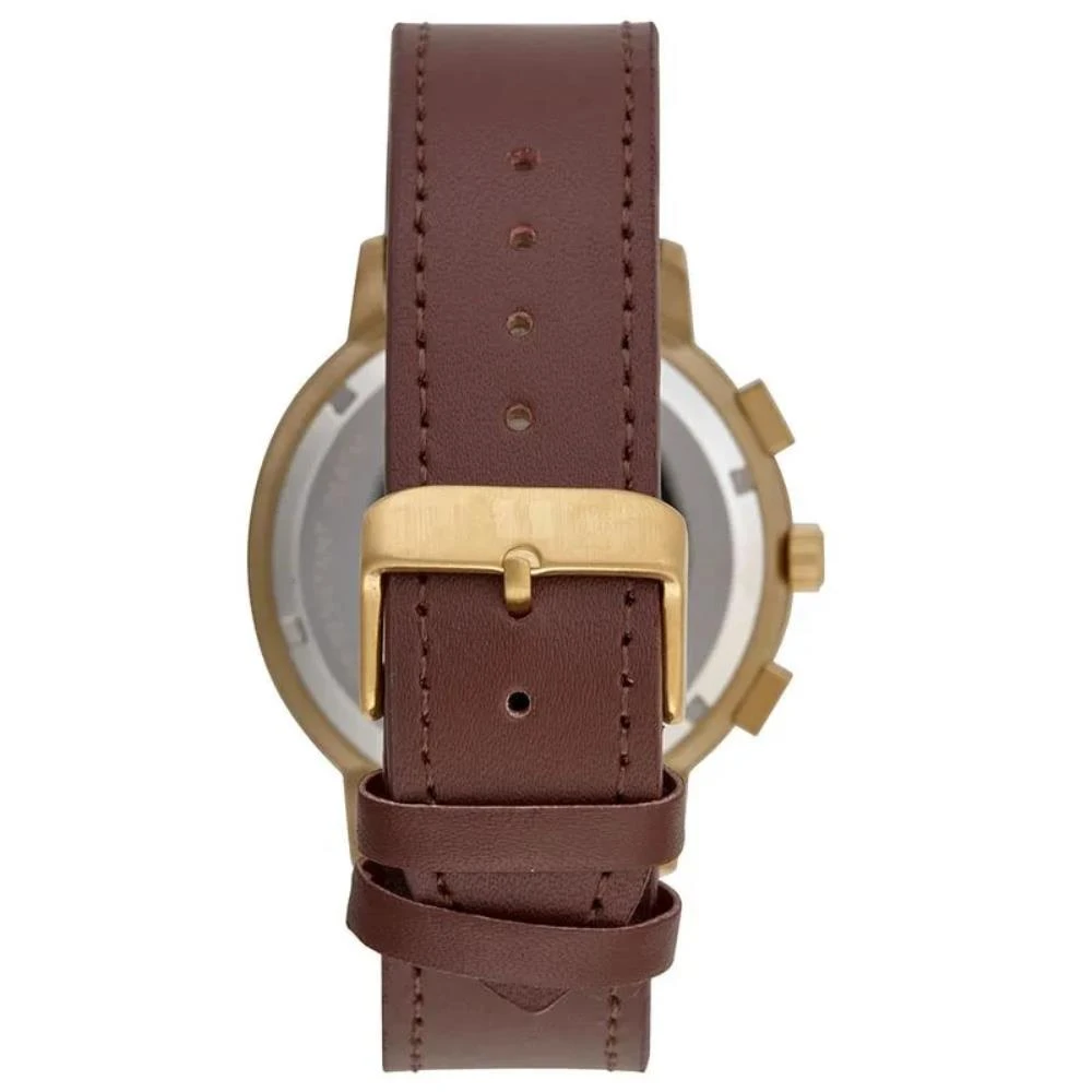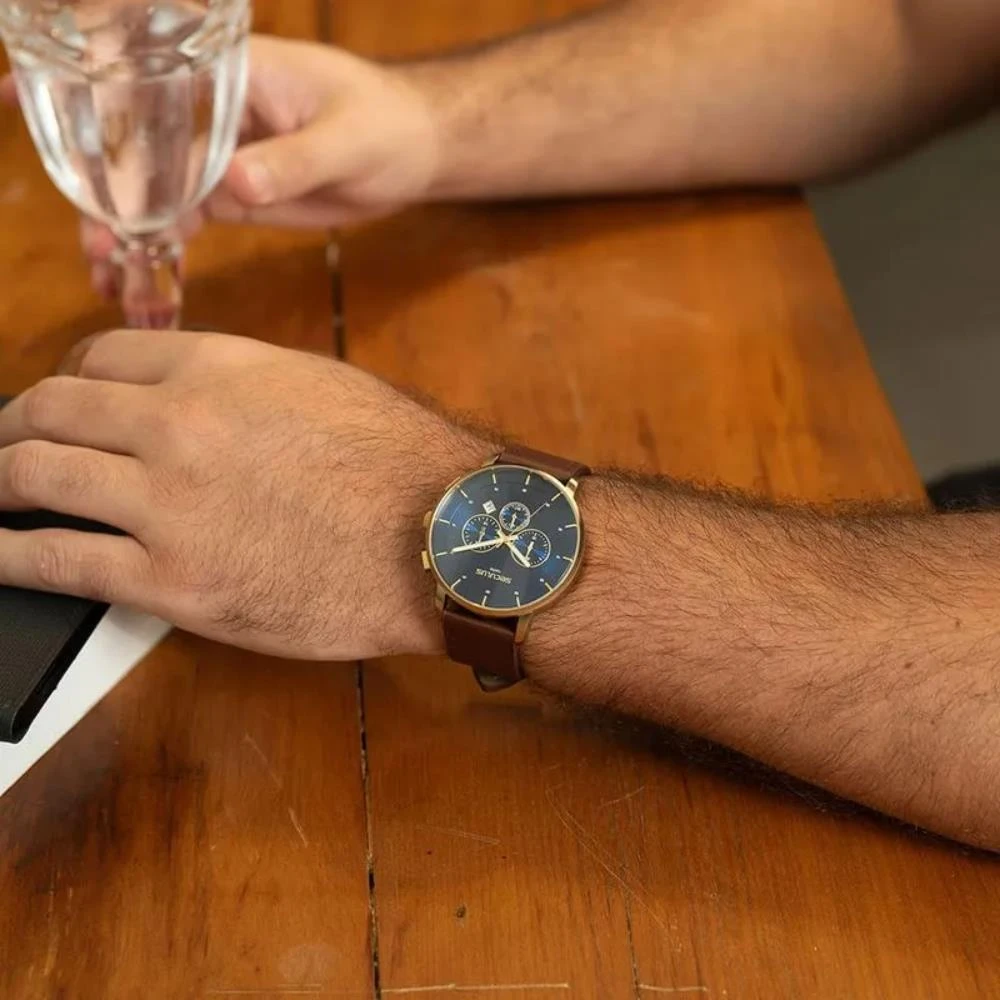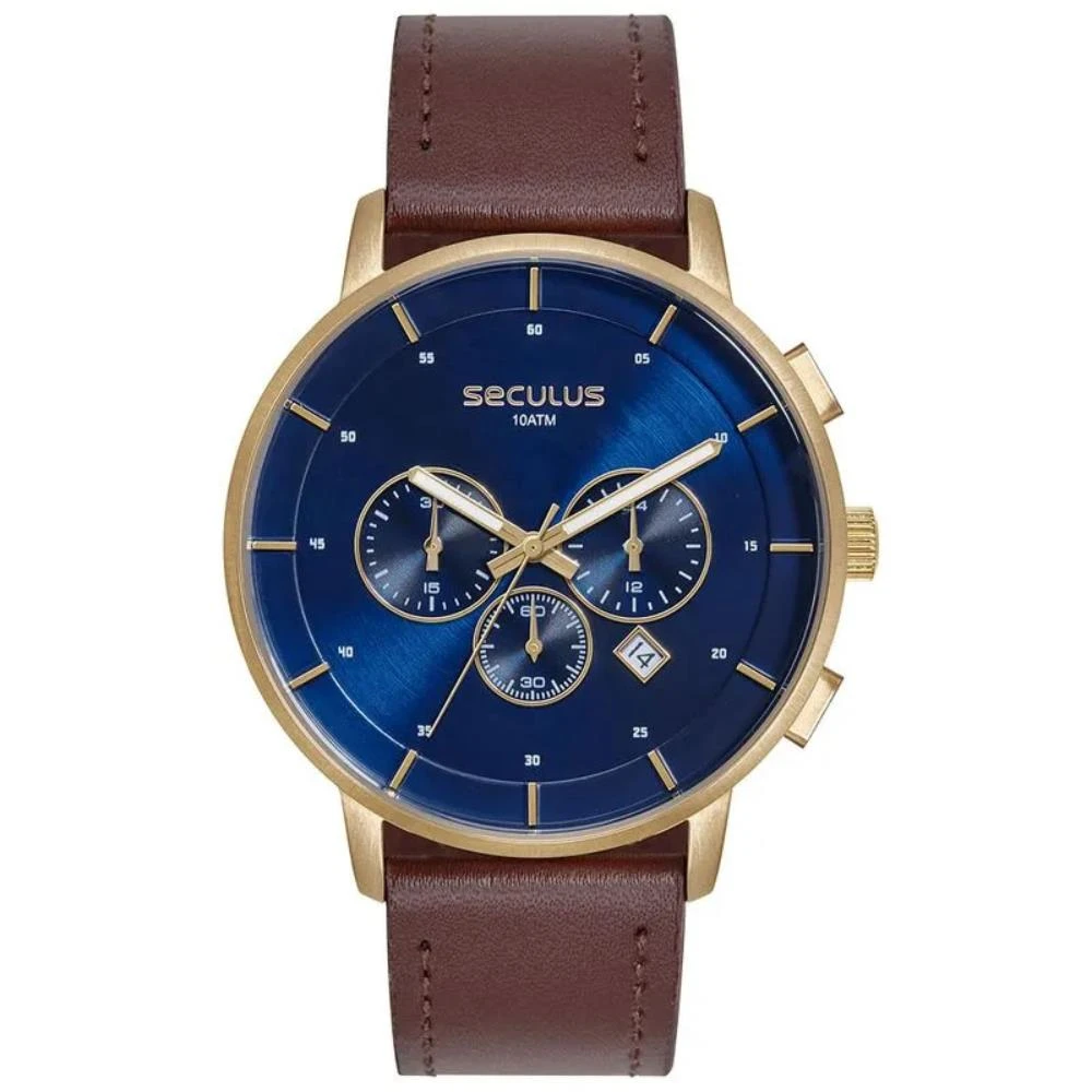 Vidro: Cristal MineralFunções: Cronógrafo, Calendário, AnalógicoResistencia à água: 100 MCaracterísticas: com caixa de Aço inoxidável e pulseira de Couro Legítimo MarromDiâmetro da caixa: 4,5 cmFundo de RoscaAlimentação do Maquinário: BateriaMostrador Azul com detalhes em Dourado