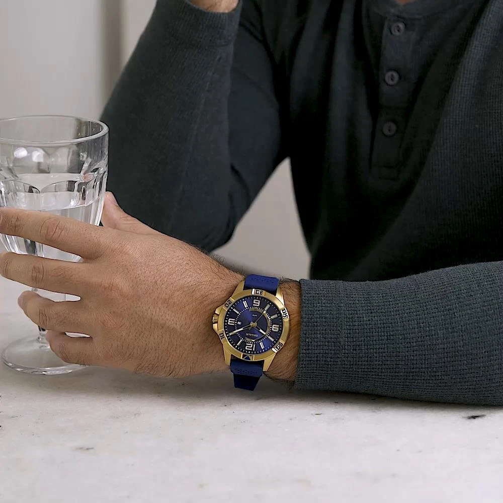 Vidro: Cristal MineralFunções: Analógico, CalendárioResistencia à água: 50 MCaracterísticas: com caixa de Aço inoxidável e pulseira de Silicone AzulDiâmetro da caixa: 4,8 cmFundo de RoscaLinha Long LifeAlimentação do Maquinário: BateriaMostrador Azul com números