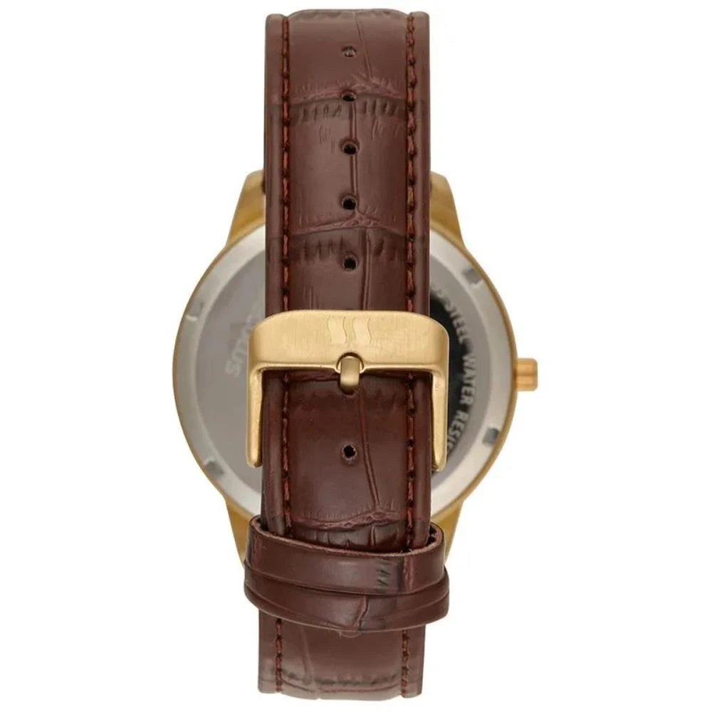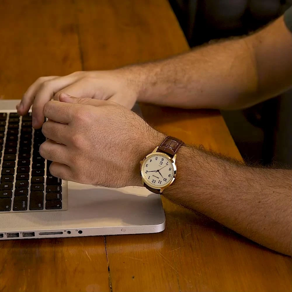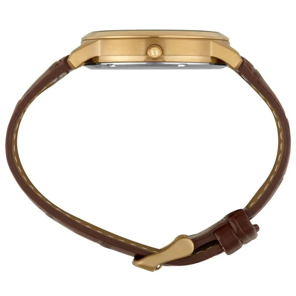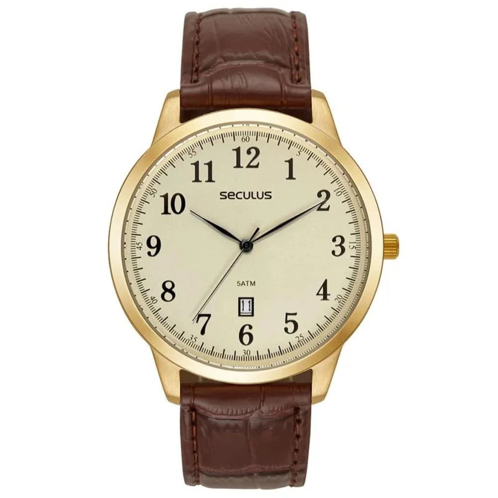 Vidro: Cristal MineralFunções: Analógico, CalendárioResistencia à água: 50 MCaracterísticas: com caixa de Aço inoxidável e pulseira de Couro Legítimo MarromDiâmetro da caixa: 4,2 cmFundo de RoscaAlimentação do Maquinário: BateriaMostrador Dourado com Todos os NúmerosGarantia de 2 anos
