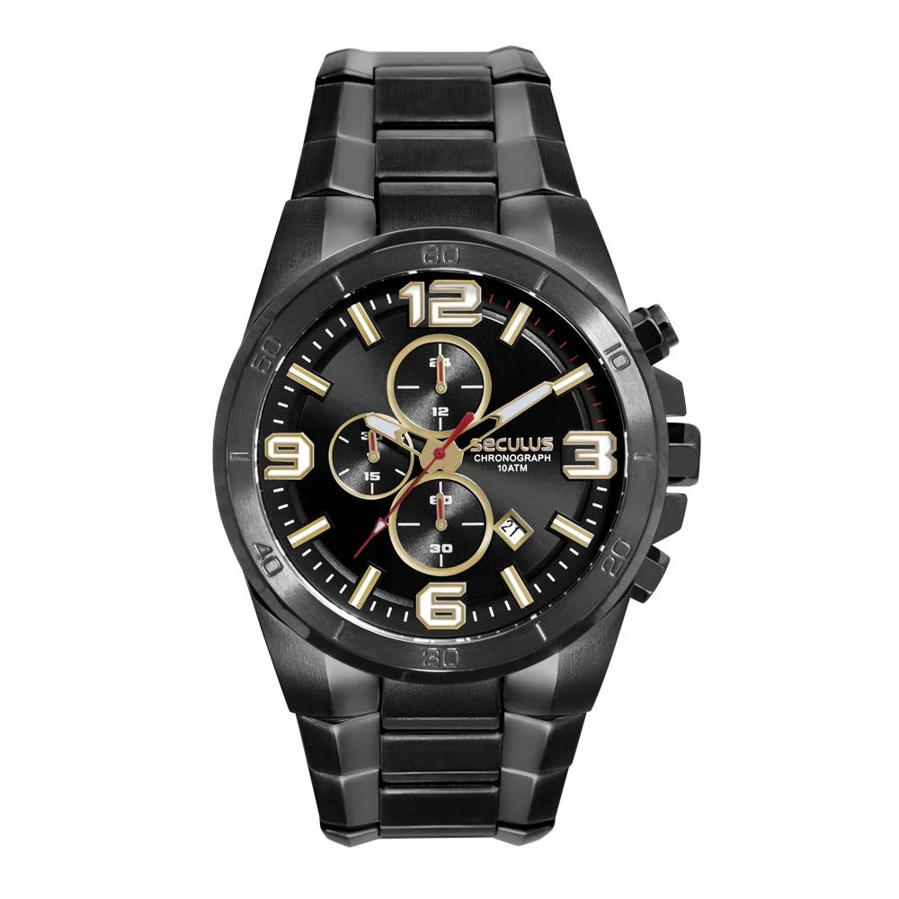 Vidro: Cristal MineralFunções: Cronógrafo, Calendário, AnalógicoResistencia à água: 100 MCaracterísticas: com caixa de Aço inoxidável e pulseira de Aço InoxidávelDiâmetro da caixa: 4,8 cmFundo de RoscaAlimentação do Maquinário: BateriaMostrador Preto com números detalhes em dourado e vermelhoAro Fixo Preto