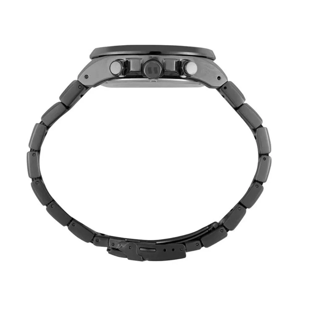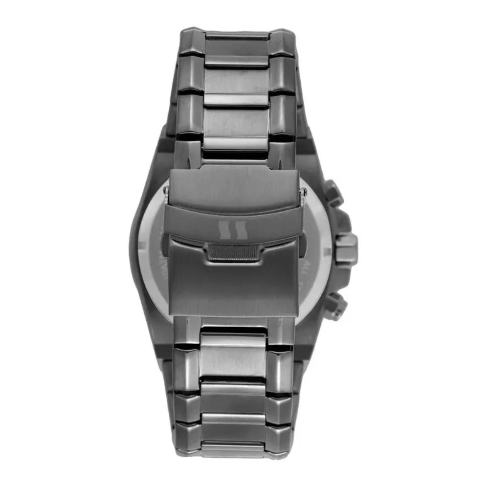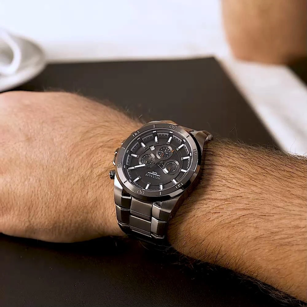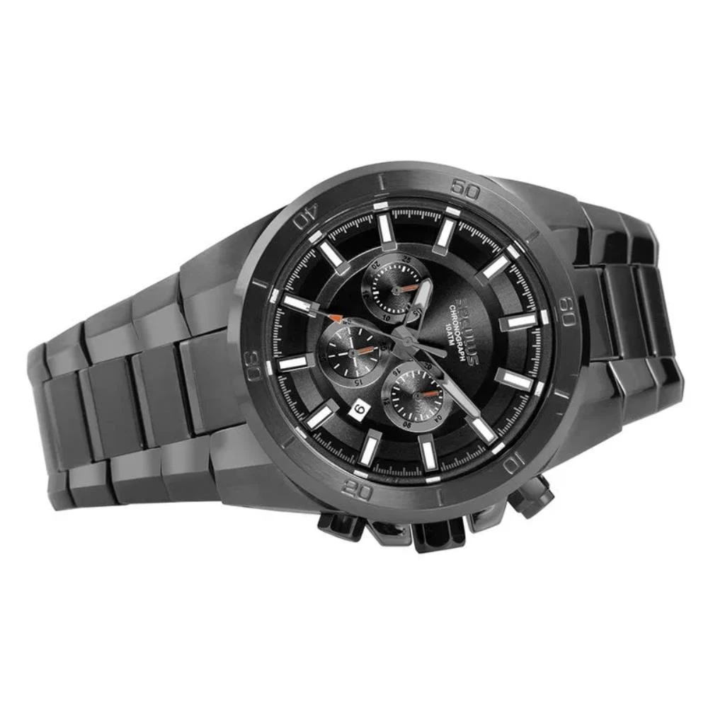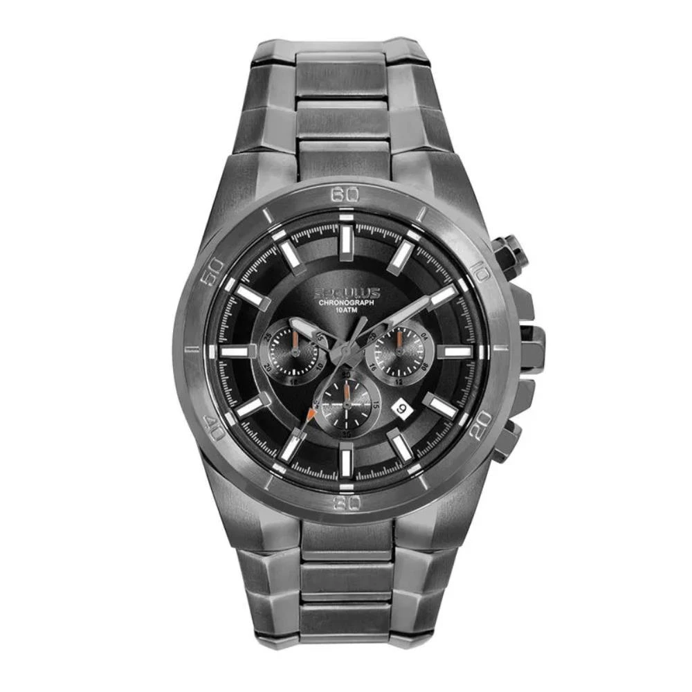 Vidro: Cristal MineralFunções: Cronógrafo, Calendário, AnalógicoResistencia à água: 100 MCaracterísticas: com caixa de Aço inoxidável e pulseira de Aço InoxidávelDiâmetro da caixa: 4,7 cmFundo de RoscaAlimentação do Maquinário: BateriaMostrador Grafite com detalhes em laranjaAro Fixo Grafite