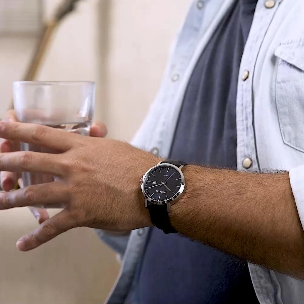 Vidro: Cristal MineralFunções: Analógico, CalendárioResistencia à água: 50 MCaracterísticas: com caixa de Aço inoxidável e pulseira de Couro Legítimo PretoDiâmetro da caixa: 4,2 cmFundo de RoscaAlimentação do Maquinário: BateriaMostrador AzulGarantia de 2 anos