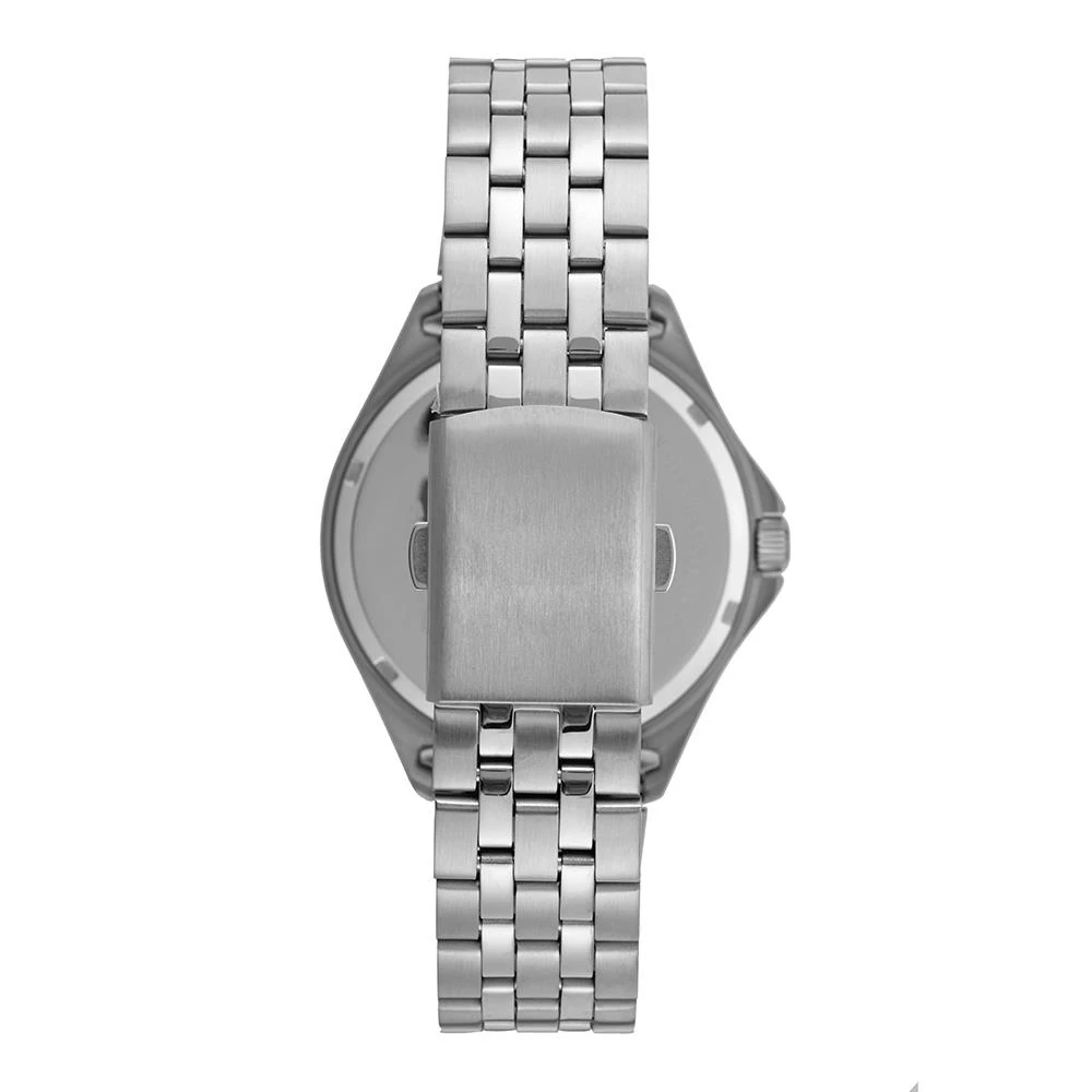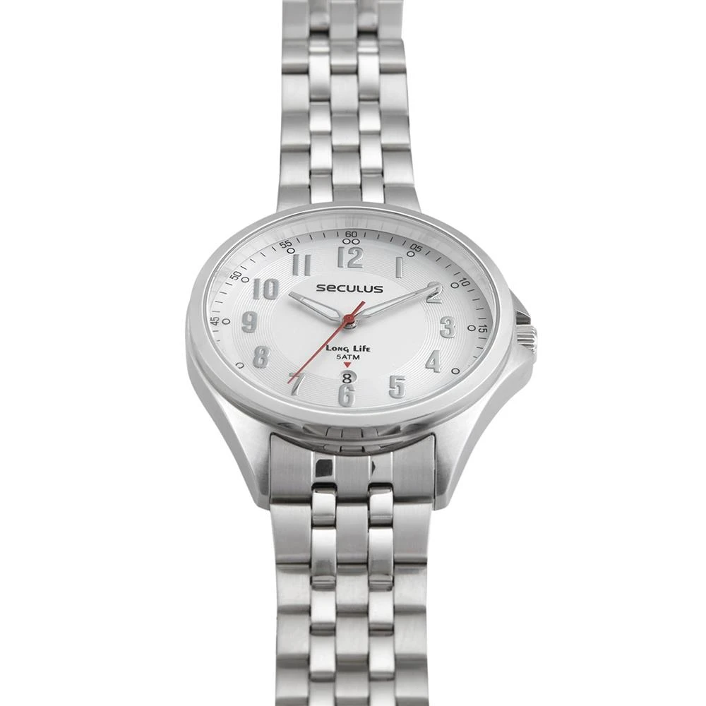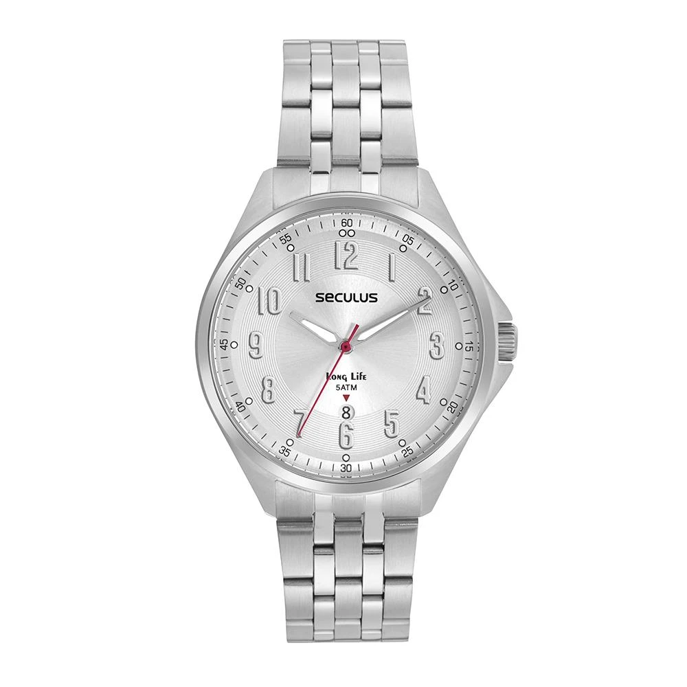 Vidro: Cristal MineralFunções: Analógico, CalendárioResistencia à água: 50 MCaracterísticas: com caixa de Aço inoxidável e pulseira de Aço InoxidávelDiâmetro da caixa: 4,2 cmFundo de RoscaLinha Long LifeAlimentação do Maquinário: BateriaMostrador prateado com todos os númerosGarantia de 2 anos