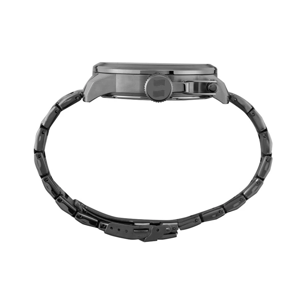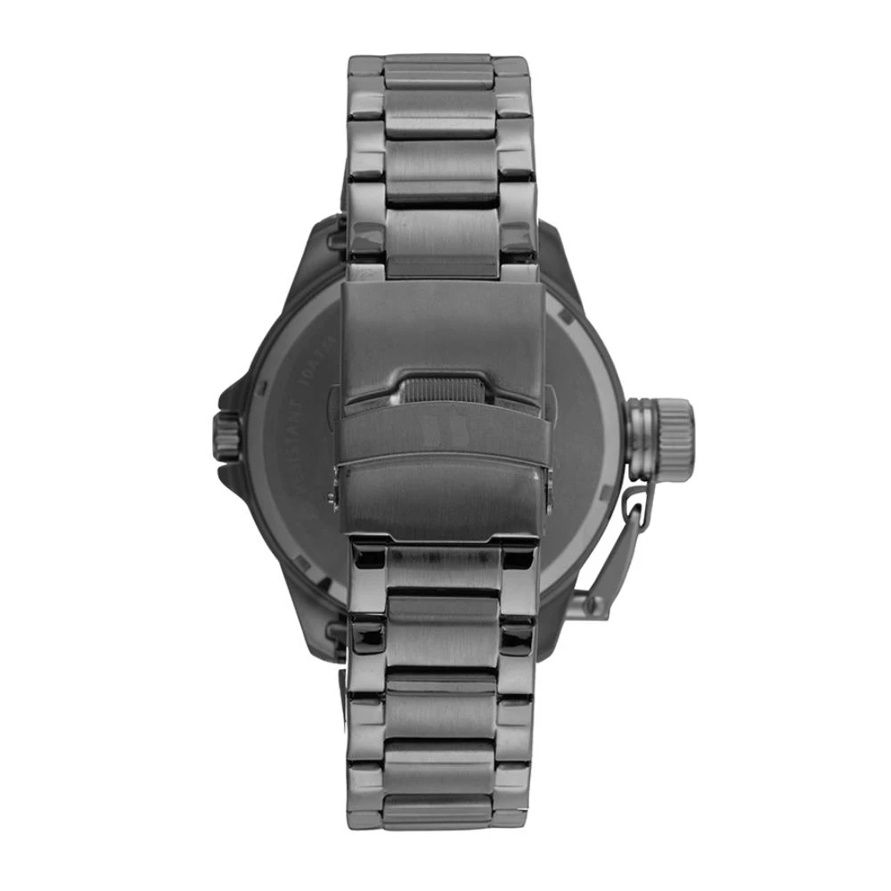 Vidro: Cristal MineralFunções: Analógico, Calendário, Dual TimeResistencia à água: 100 MCaracterísticas: com caixa de Aço inoxidável e pulseira de Aço InoxidávelDiâmetro da caixa: 5,0 cmFundo de RoscaLinha Long LifeAlimentação do Maquinário: BateriaMostrador Cinza com númerosCoroa Esquerda com Escotilha rosqueávelGarantia de 2 anos