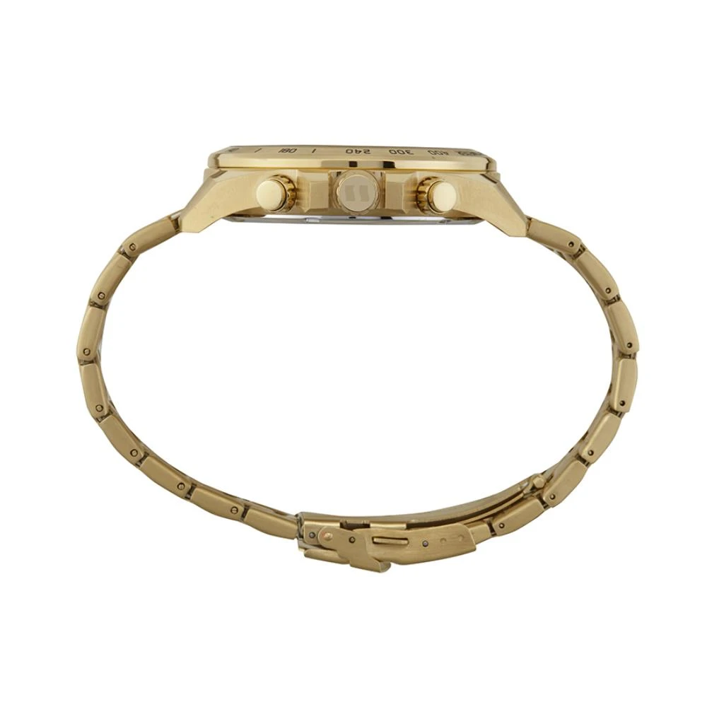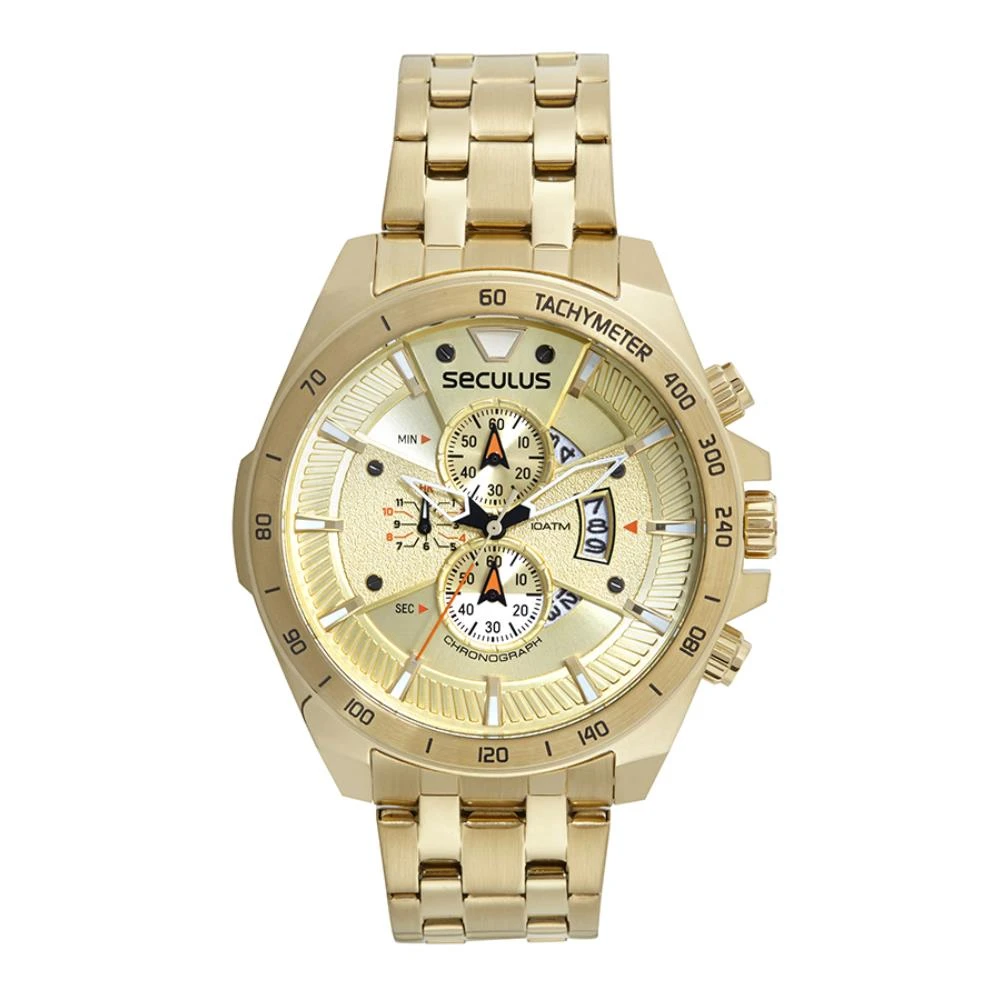 Vidro: Cristal MineralFunções: Cronógrafo, Calendário, AnalógicoResistencia à água: 100 MCaracterísticas: com caixa de Aço inoxidável e pulseira de Aço InoxidávelDiâmetro da caixa: 5,0 cmFundo de RoscaAlimentação do Maquinário: BateriaMostrador Champanhe