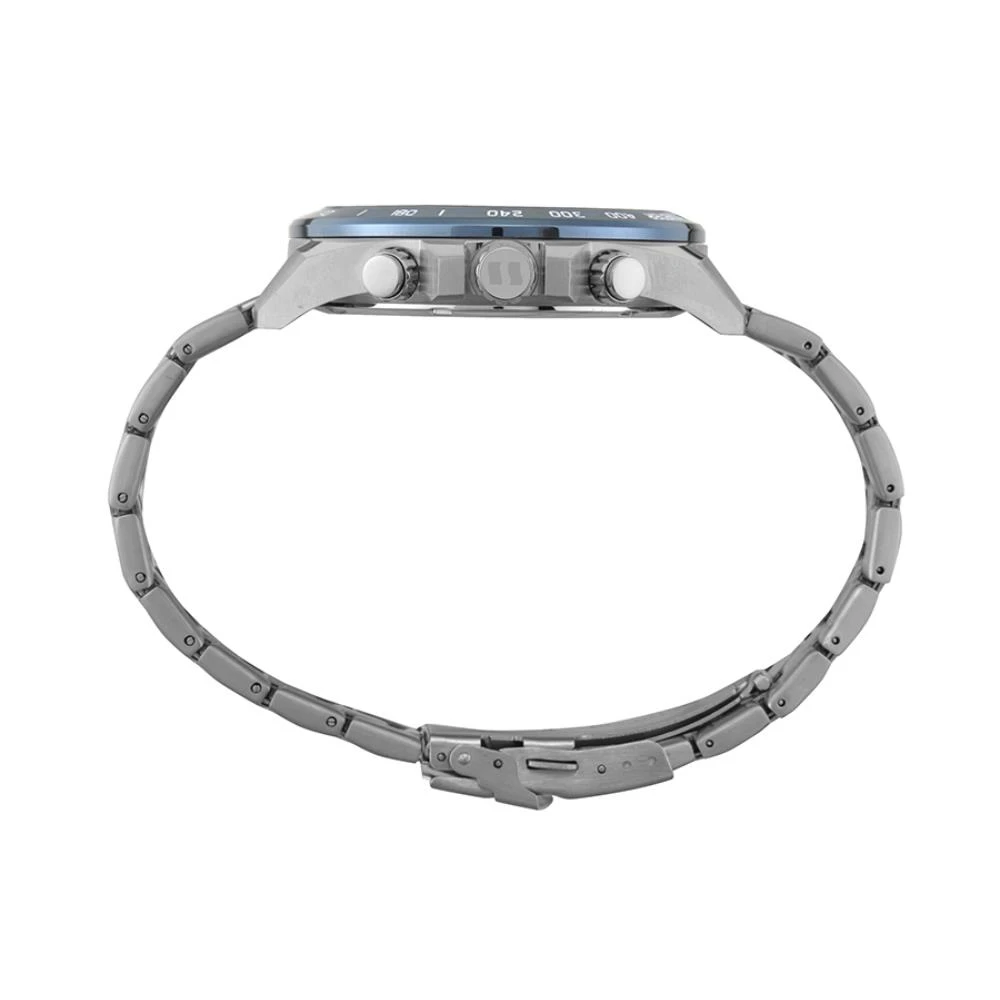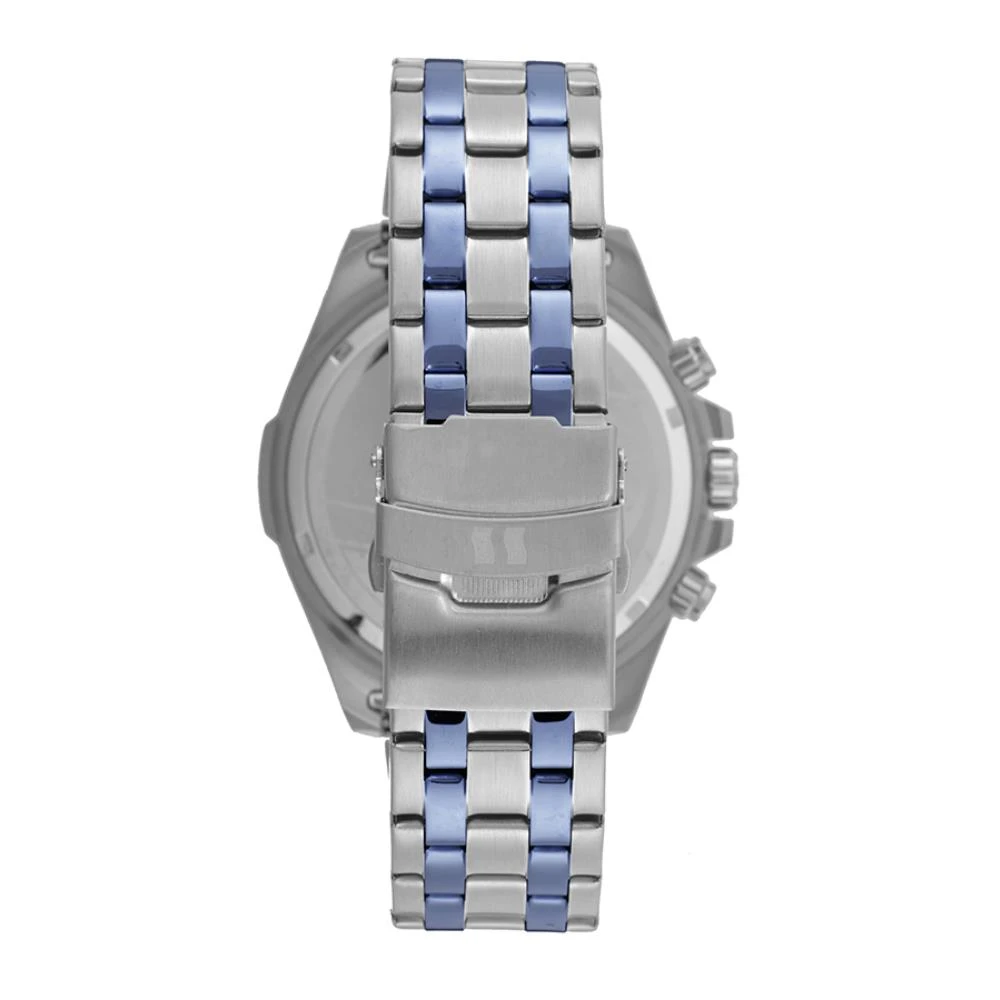 Vidro: Cristal MineralFunções: Cronógrafo, Calendário, AnalógicoResistencia à água: 100 MCaracterísticas: com caixa de Aço inoxidável e pulseira de Aço InoxidávelDiâmetro da caixa: 5,0 cmFundo de RoscaAlimentação do Maquinário: BateriaMostrador AzulPrateado com Azul
