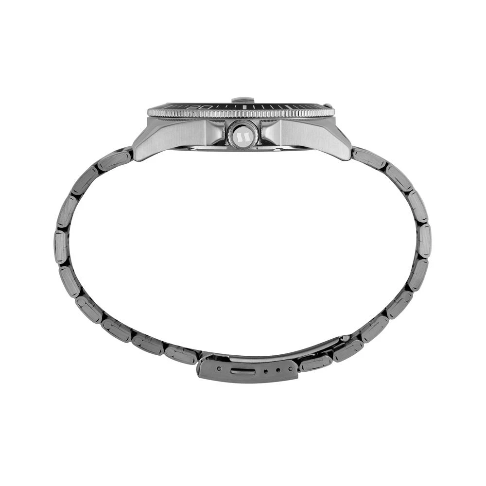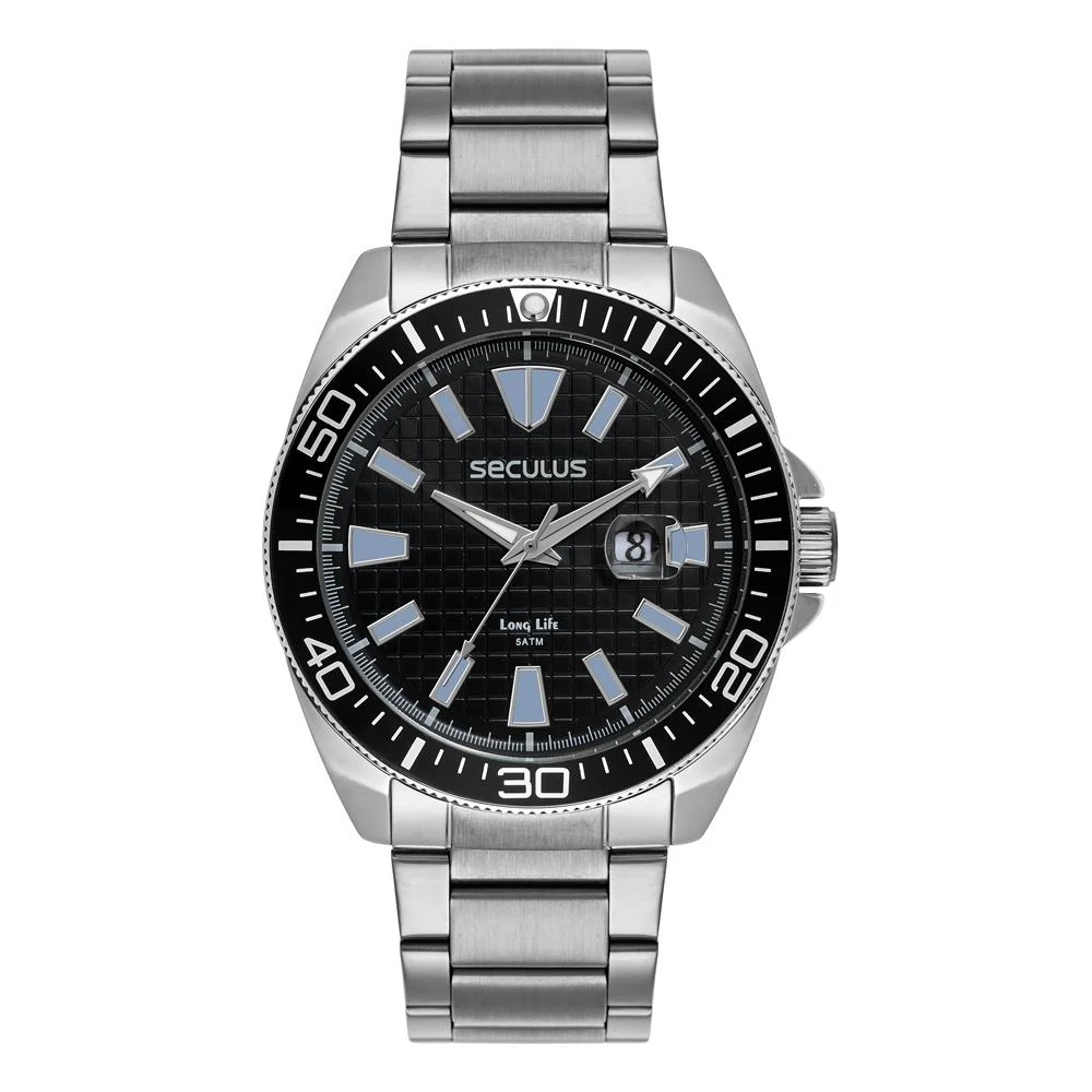 Vidro: Cristal MineralFunções: Analógico, CalendárioResistencia à água: 50 MCaracterísticas: com caixa de Aço inoxidável e pulseira de Aço InoxidávelDiâmetro da caixa: 4,5 cmFundo de RoscaLinha Long LifeAlimentação do Maquinário: BateriaMostrador PretoAro Fixo PretoGarantia de 2 anos