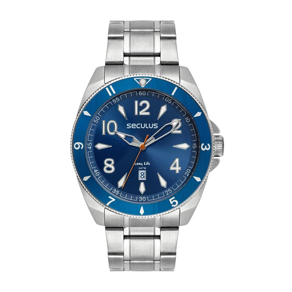 Vidro: Cristal MineralFunções: Analógico, CalendárioResistencia à água: 50 MCaracterísticas: com caixa de Aço inoxidável e pulseira de Aço InoxidávelDiâmetro da caixa: 4,6 cmFundo de RoscaLinha Long LifeAlimentação do Maquinário: BateriaMostrador Azul com númerosAro Fixo AzulGarantia de 2 anos