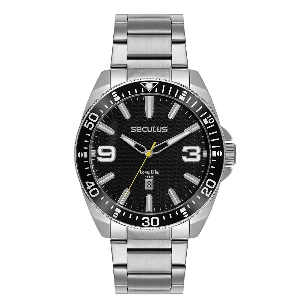 Vidro: Cristal MineralFunções: Analógico, CalendárioResistencia à água: 50 MCaracterísticas: com caixa de Aço inoxidável e pulseira de Aço InoxidávelDiâmetro da caixa: 4,7 cmFundo de RoscaLinha Long LifeAlimentação do Maquinário: BateriaMostrador Preto com númerosAro Fixo PretoGarantia de 2 anos