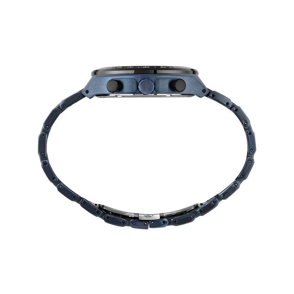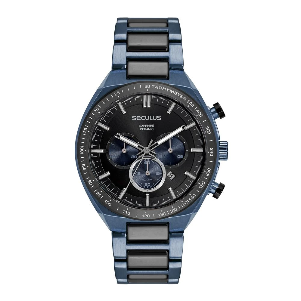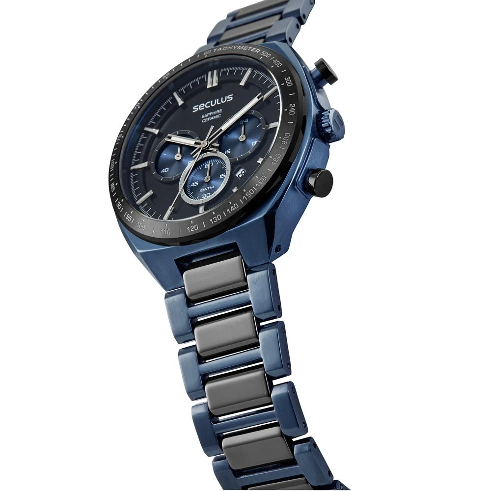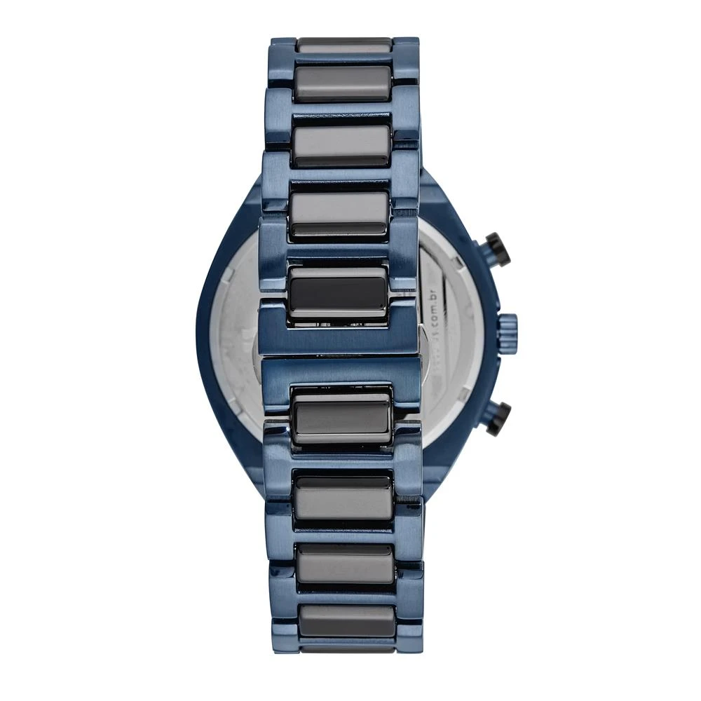 Vidro: SafiraFunções: Cronógrafo, Calendário, AnalógicoResistencia à água: 100 MCaracterísticas: com caixa de Aço inoxidável e pulseira de Aço Inoxidável Azul e Detalhes em Cerâmica GrafiteDiâmetro da caixa: 4,7 cmFundo de RoscaAlimentação do Maquinário: BateriaMostrador Grafite com Detalhes AzulAro Fixo Grafite