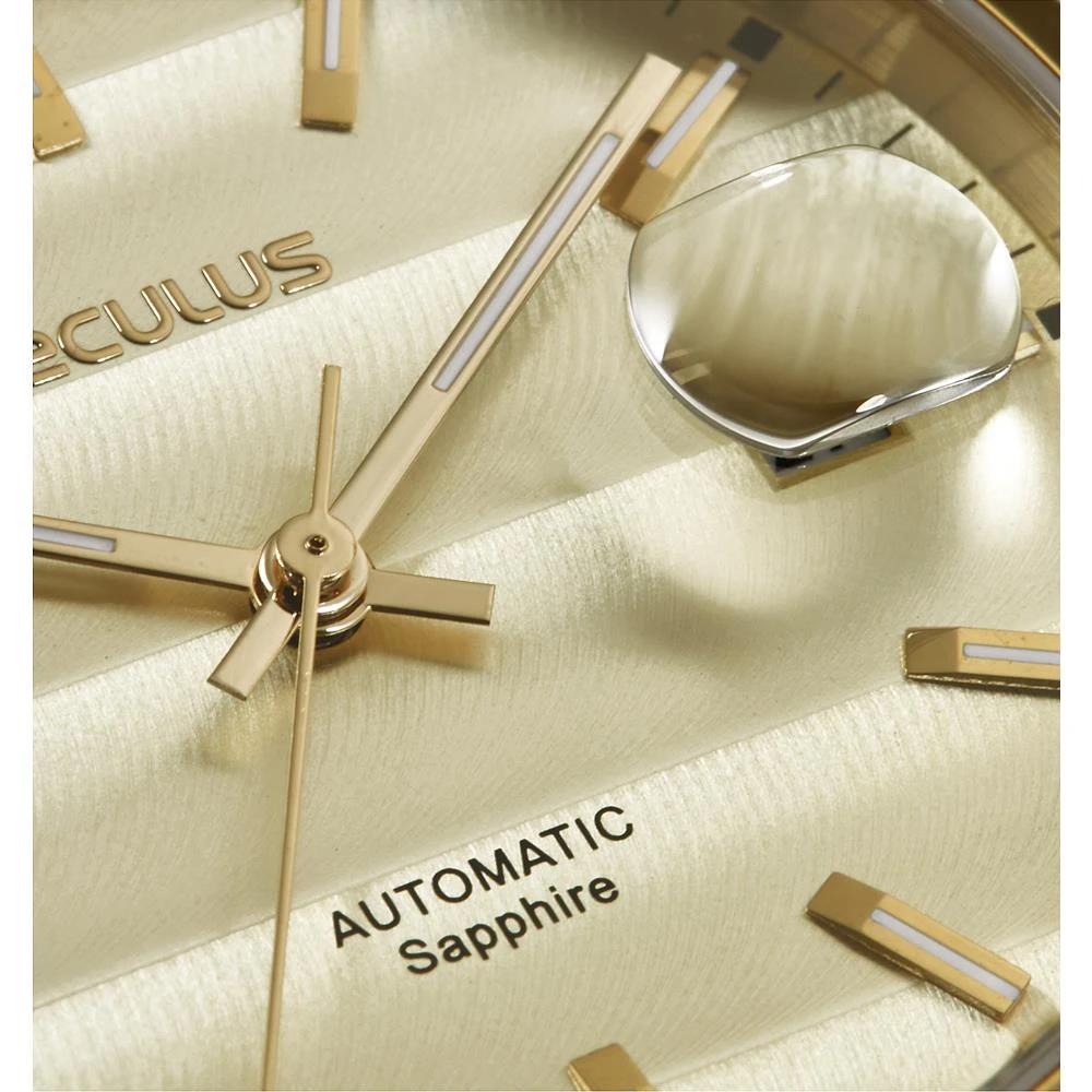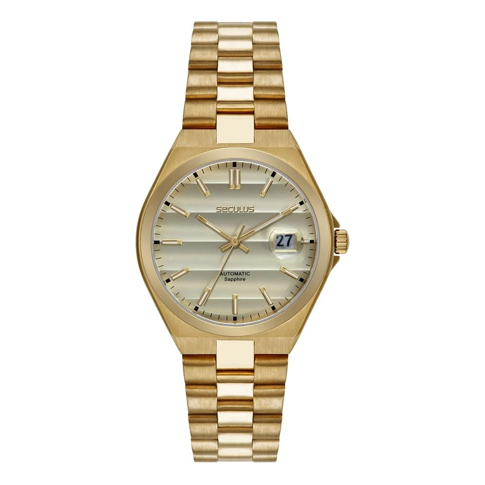 Vidro: Cristais de SafiraFunções: Automático, Analógico, Calendário com LupaResistencia à água: 50 MCaracterísticas: com caixa de Aço inoxidável e pulseira de Aço InoxidávelDiâmetro da caixa: 4,0 cmFundo RosqueadoCom fundo de vidro que permite a visualização do maquinário em funcionamentoLinha: Seculus AutomaticAlimentação do Maquinário: Mecânico (Automático, Corda).Mostrador DouradoGarantia de 2 anos