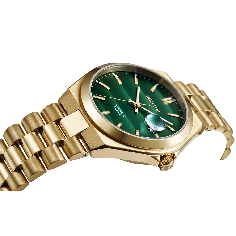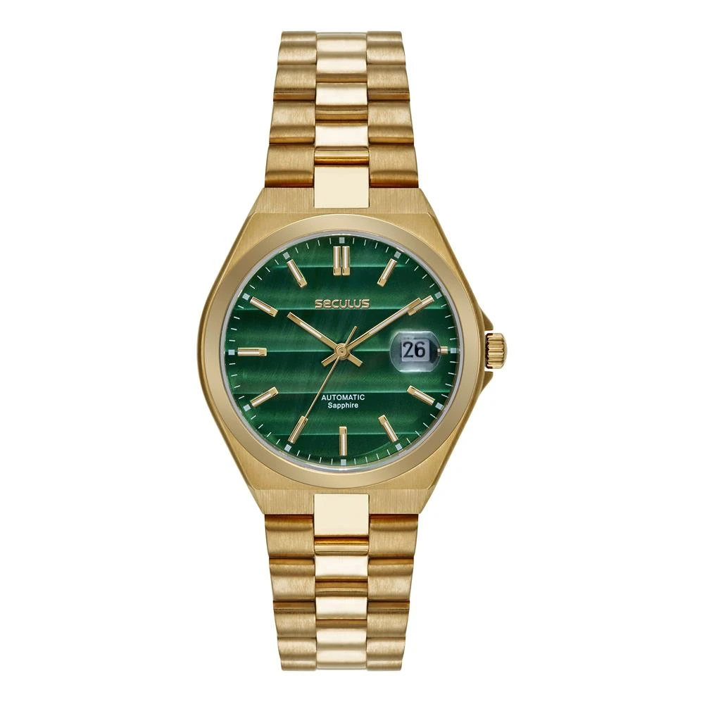 Vidro: Cristais de SafiraFunções: Automático, Analógico, Calendário com LupaResistencia à água: 50 MCaracterísticas: com caixa de Aço inoxidável e pulseira de Aço InoxidávelDiâmetro da caixa: 4,0 cmFundo RosqueadoCom fundo de vidro que permite a visualização do maquinário em funcionamentoLinha: Seculus AutomaticAlimentação do Maquinário: Mecânico (Automático, Corda).Mostrador VerdeGarantia de 2 anos