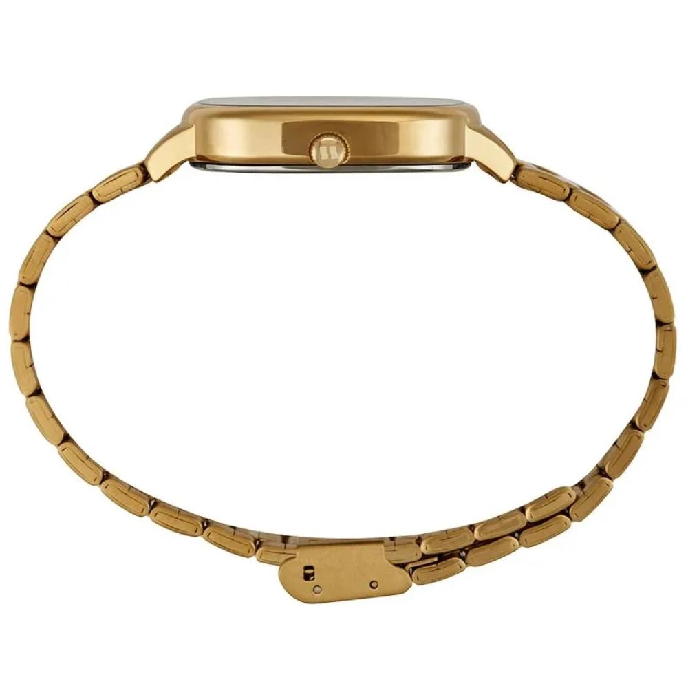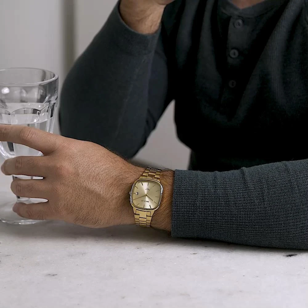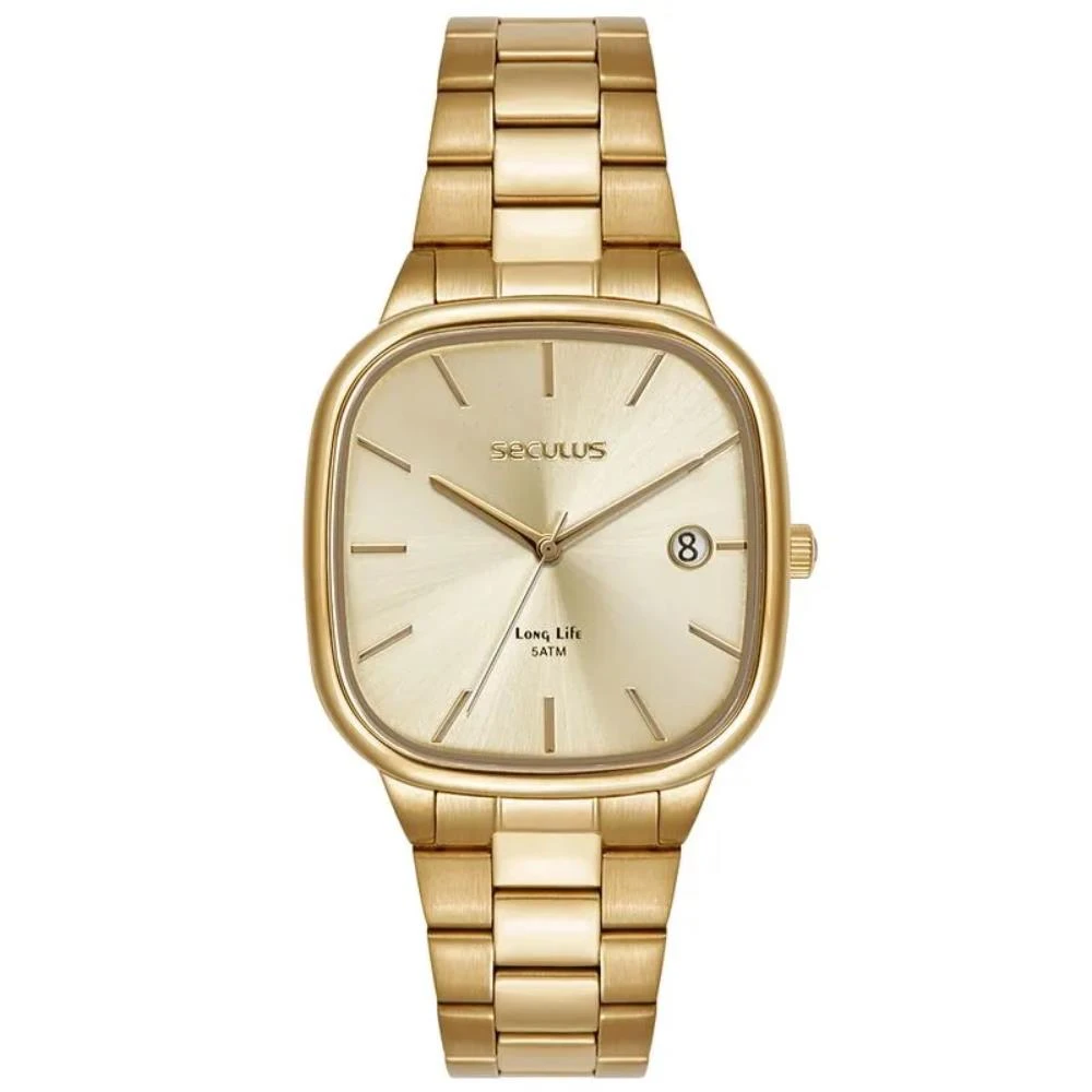 Vidro: Cristal MineralFunções: Analógico, Calendário, RetangularResistencia à água: 50 MCaracterísticas: com caixa de Aço inoxidável e pulseira de Aço InoxidávelDiâmetro da caixa: 3,6 cm x 3,6 cmFundo de PRessãoAlimentação do Maquinário: BateriaMostrador DouradoGarantia de 2 anos