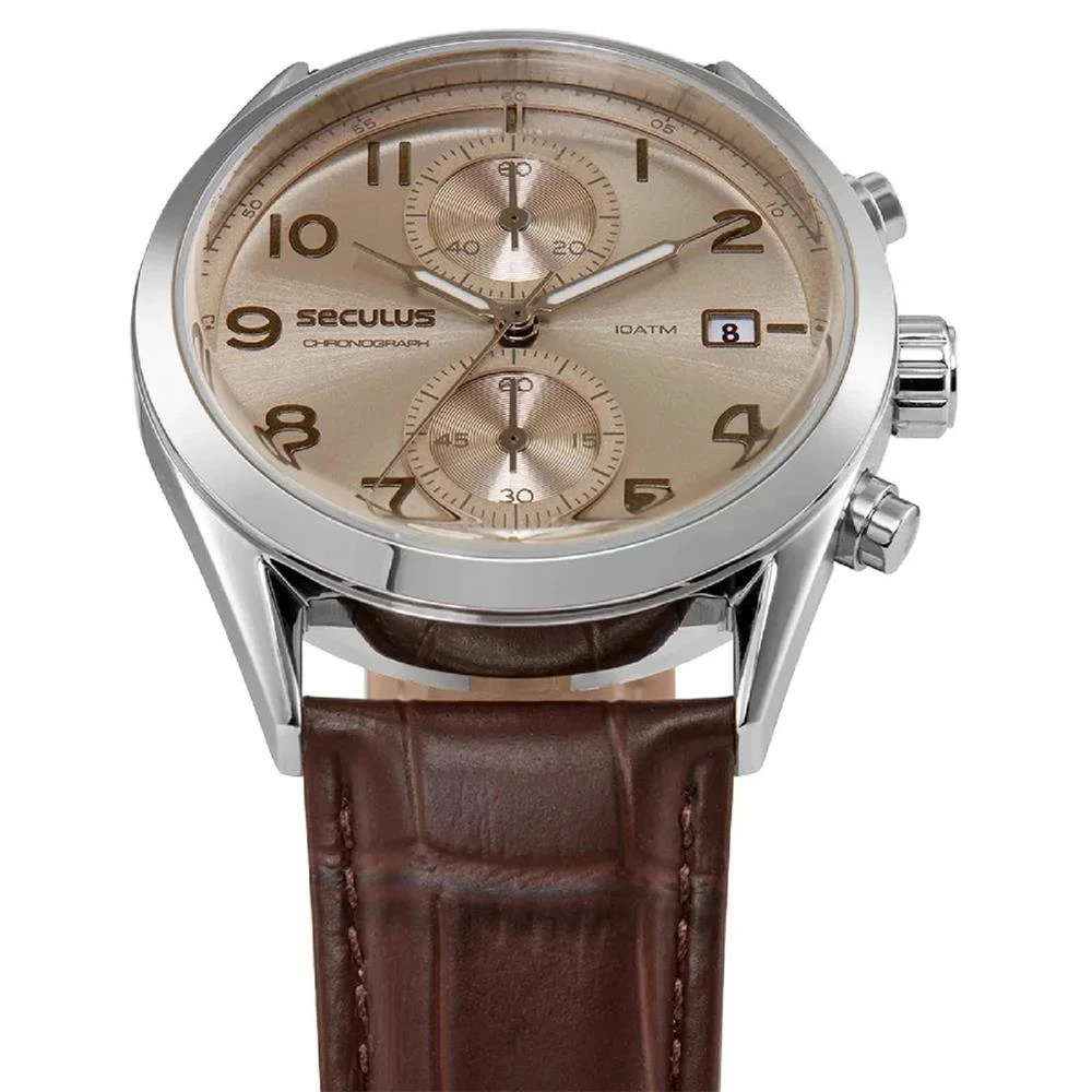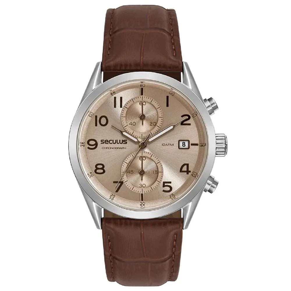 Vidro: Cristal MineralFunções: Cronógrafo, Calendário, AnalógicoResistencia à água: 100 MCaracterísticas: com caixa de Aço inoxidável e pulseira de Couro Legítimo MarromDiâmetro da caixa: 4,0 cmFundo de RoscaAlimentação do Maquinário: BateriaMostrador Marrom Claro com números