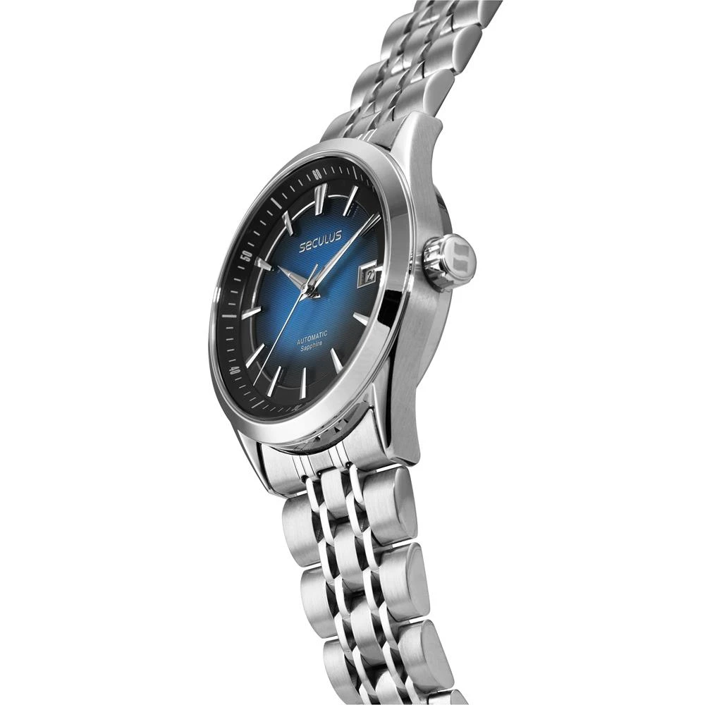 Vidro: Cristais de SafiraFunções: Automático, Analógico, CalendárioResistencia à água: 50 MCaracterísticas: com caixa de Aço inoxidável e pulseira de Aço InoxidávelDiâmetro da caixa: 4,0 cmFundo RosqueadoCom fundo de vidro que permite a visualização do maquinário em funcionamentoLinha: Seculus AutomaticAlimentação do Maquinário: Mecânico (Automático, Corda).Mostrador Azul degradêGarantia de 2 anos