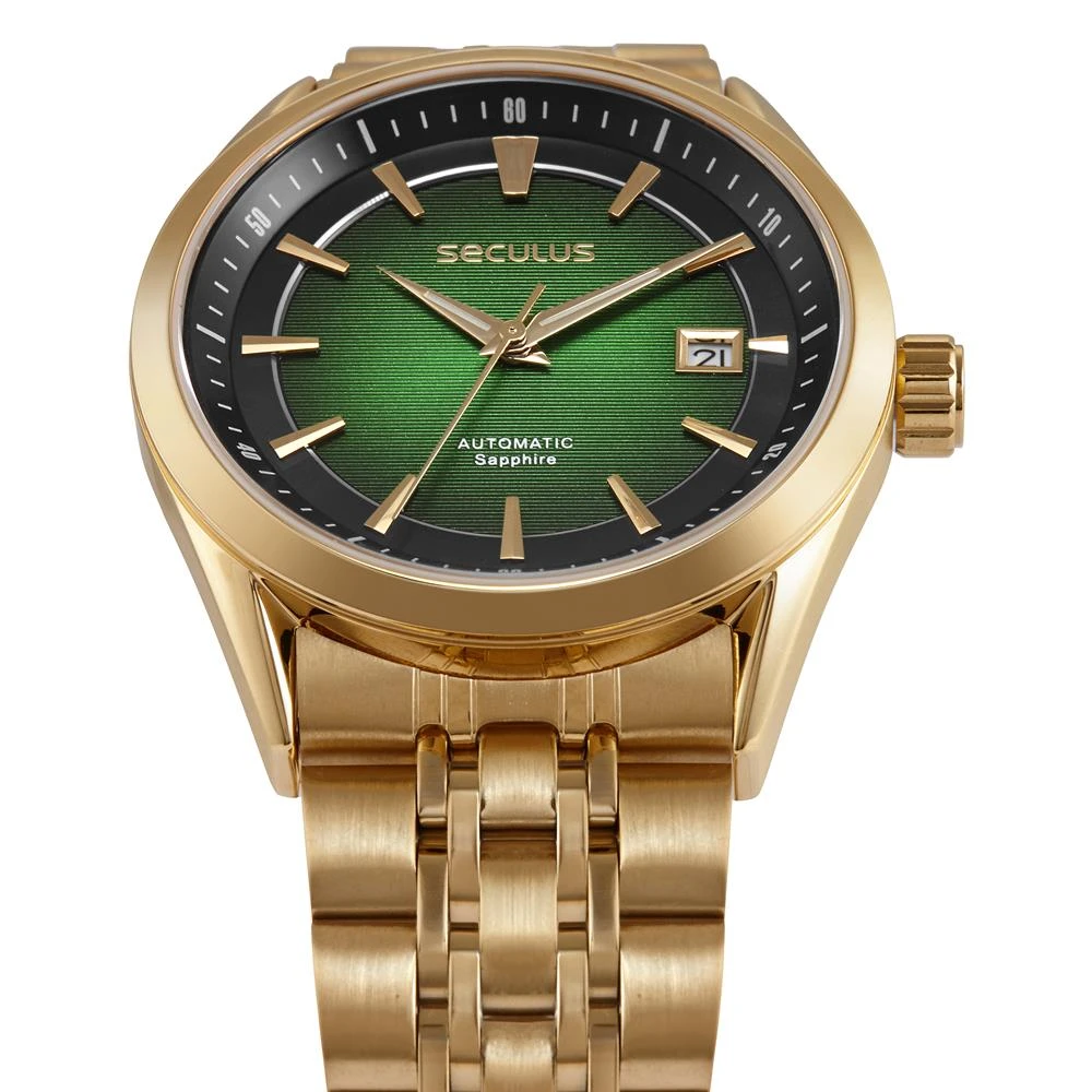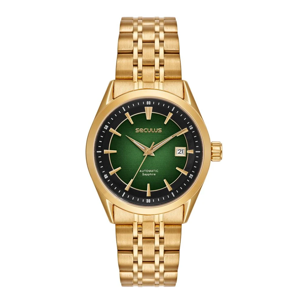 Vidro: Cristais de SafiraFunções: Automático, Analógico, CalendárioResistencia à água: 50 MCaracterísticas: com caixa de Aço inoxidável e pulseira de Aço InoxidávelDiâmetro da caixa: 4,0 cmFundo RosqueadoCom fundo de vidro que permite a visualização do maquinário em funcionamentoLinha: Seculus AutomaticAlimentação do Maquinário: Mecânico (Automático, Corda).Mostrador Verde degradêGarantia de 2 anos
