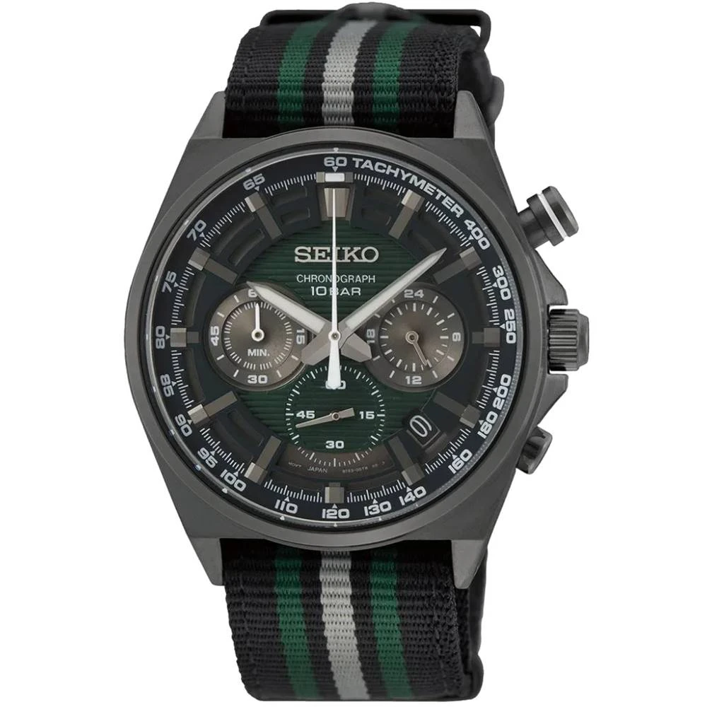 Características: com caixa Aço inoxidável e pulseira de Poliamida NATO Preta/Verde/Cinza
