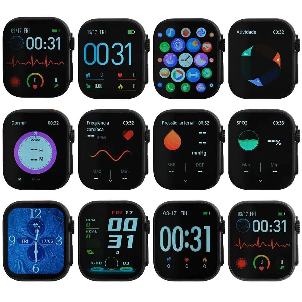 - Monitoramento cardíaco (Frequência Cardíaca)- Contador de passos e distância- Saturação de O2- Pressão arterial- Temperatura Corporal- Lembrete de Alongamento