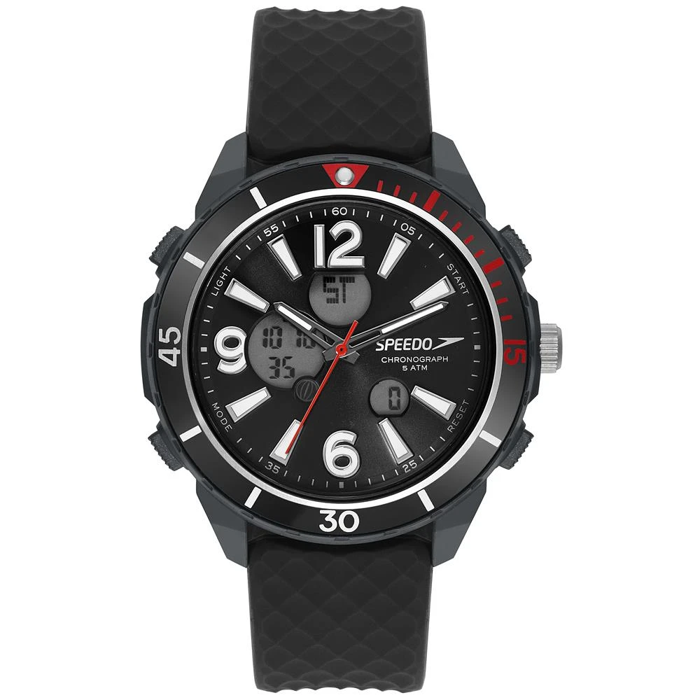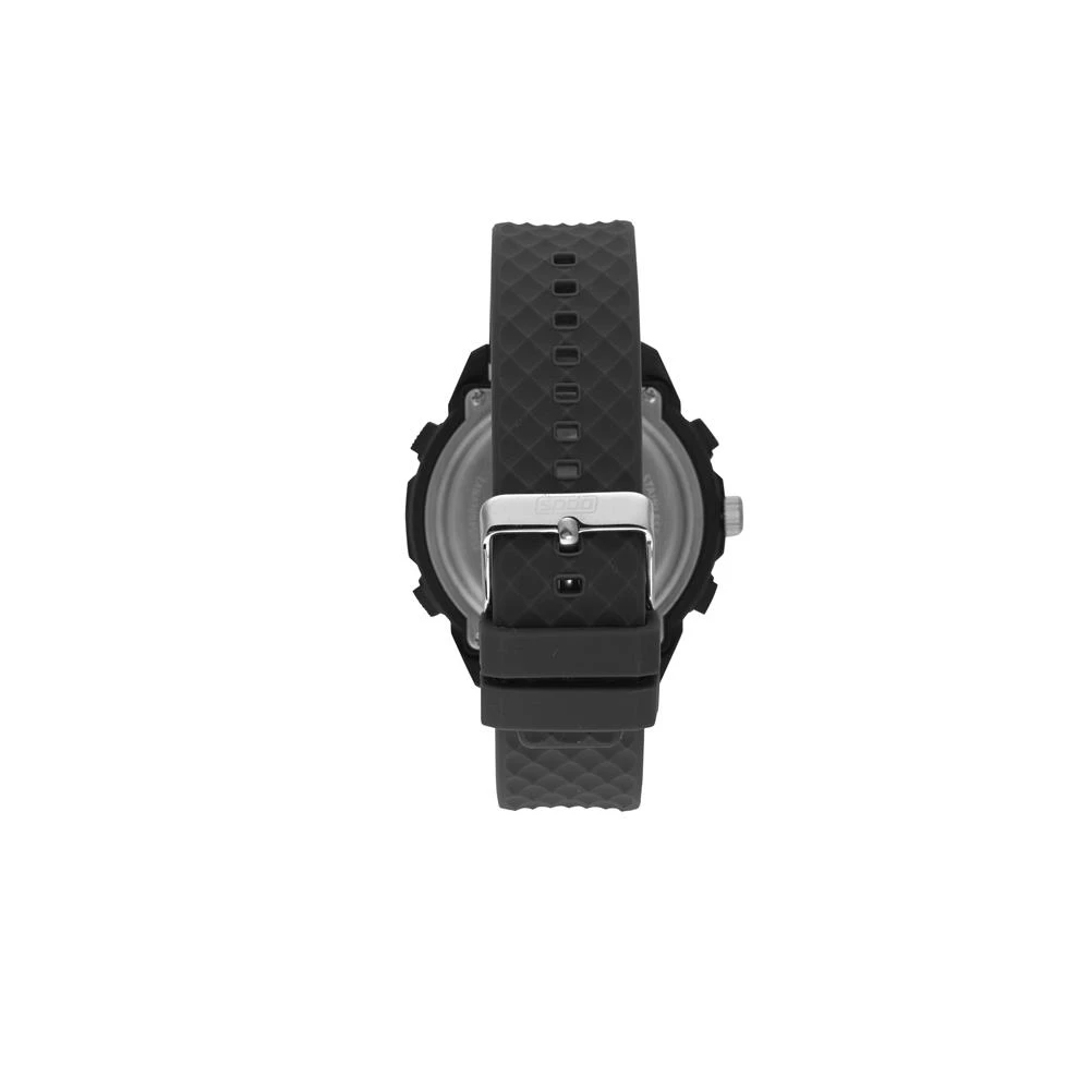 Funções: Anadigi, Iluminação, Alarme, CronógrafoResistência à Água: 50 mDiâmetro da Caixa: 51 mmCaracterísticas: com caixa em Policarbonato Grafite e pulseira em Silicone pretoFundo ParafusadoVidro: AcrílicoAlimentação do Maquinário: BateriaMostrador Preto com Números e detalhes em brancoAro Fixo Preto com detalhes em vermelhoGarantia de 1 ano