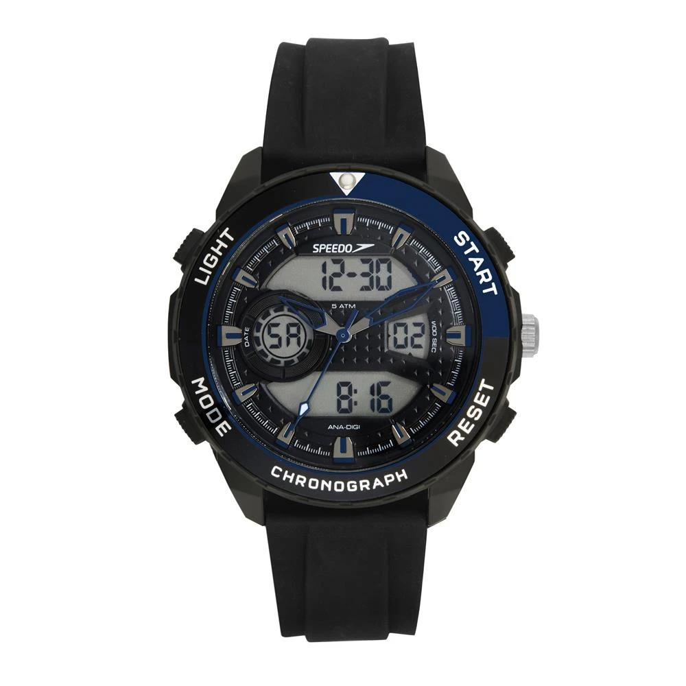 Funções: Anadigi, Iluminação, Alarme, CronógrafoResistência à Água: 50 mDiâmetro da Caixa: 50 mmCaracterísticas: com caixa em Policarbonato Preto e pulseira em Silicone PretoFundo ParafusadoVidro: AcrílicoAlimentação do Maquinário: BateriaMostrador PretoAro fixo preto com azulGarantia de 1 ano